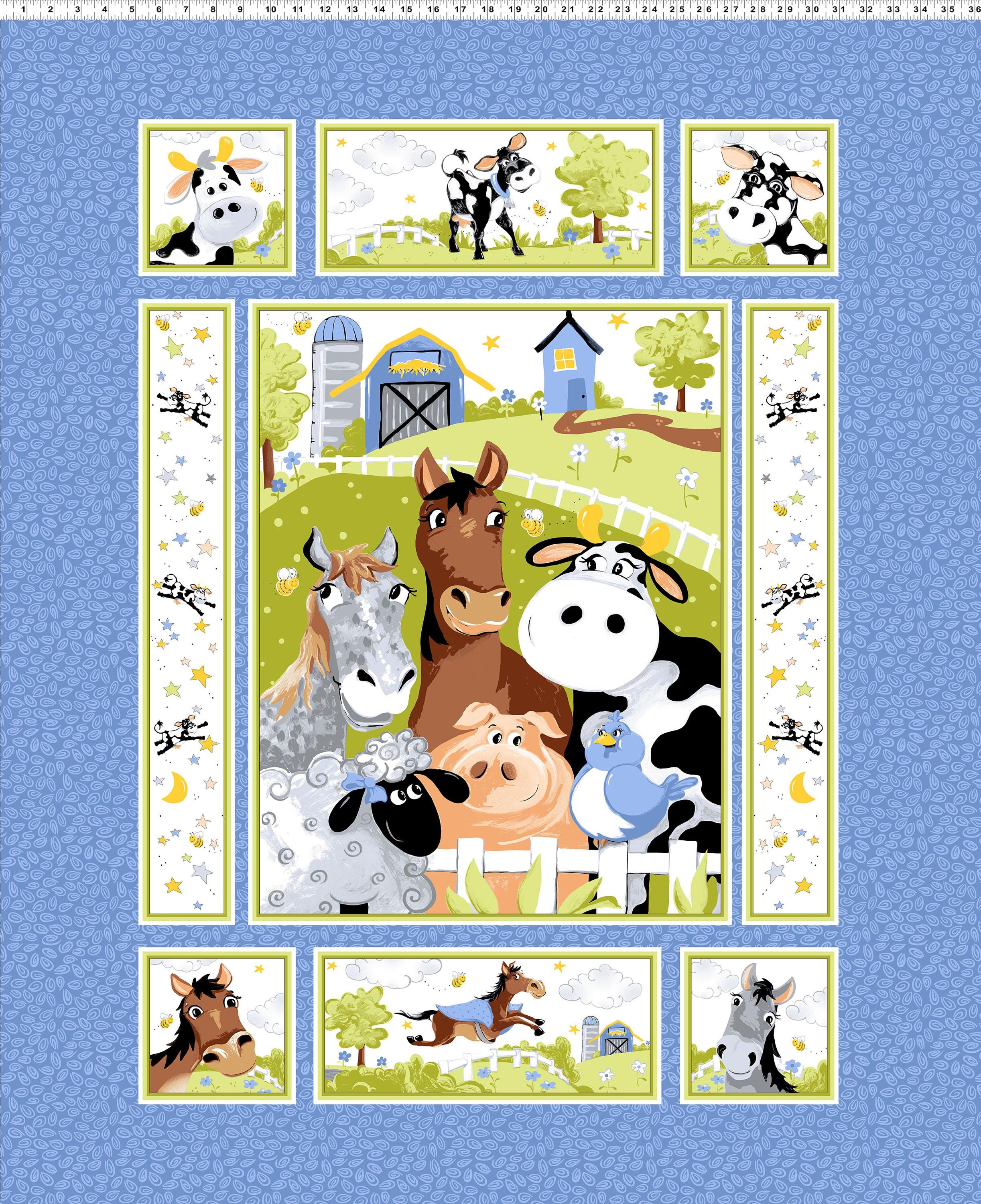 Sized 38" x 48", this adorable quilt features playful barnyard animals designed by Susybee — perfect for a nursery, toddler gift, or cheerful wall hanging.