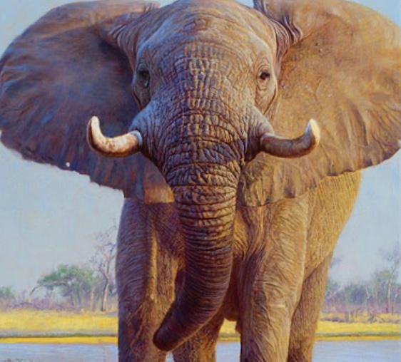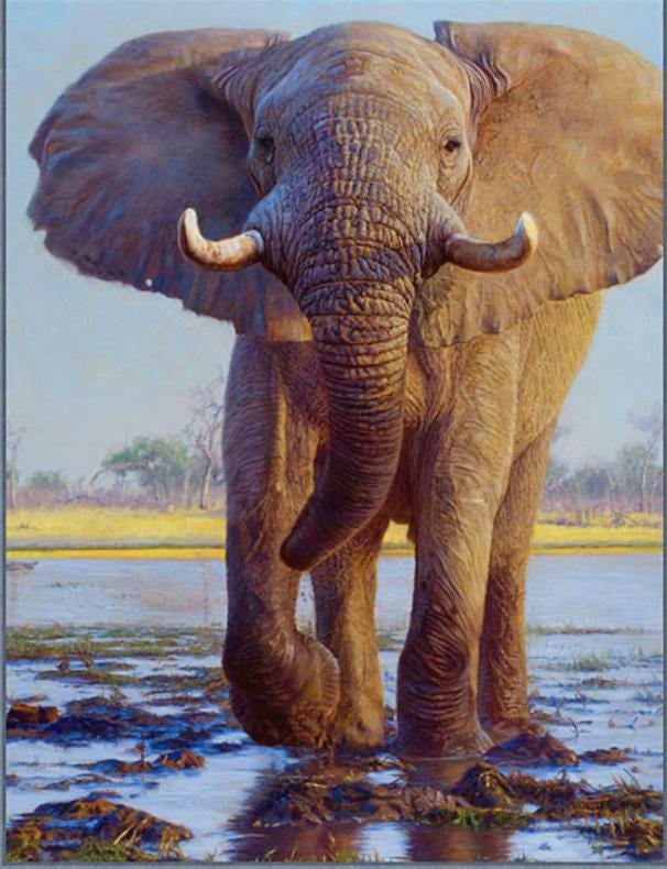 This breathtaking artwork captures the strength and presence of an elephant striding confidently through sunlit waters, surrounded by tranquil hues of Taupe, Sandstone, Ash Gray, Straw Yellow, Leaf Green, Powder Blue, Mist Blue, and Slate.