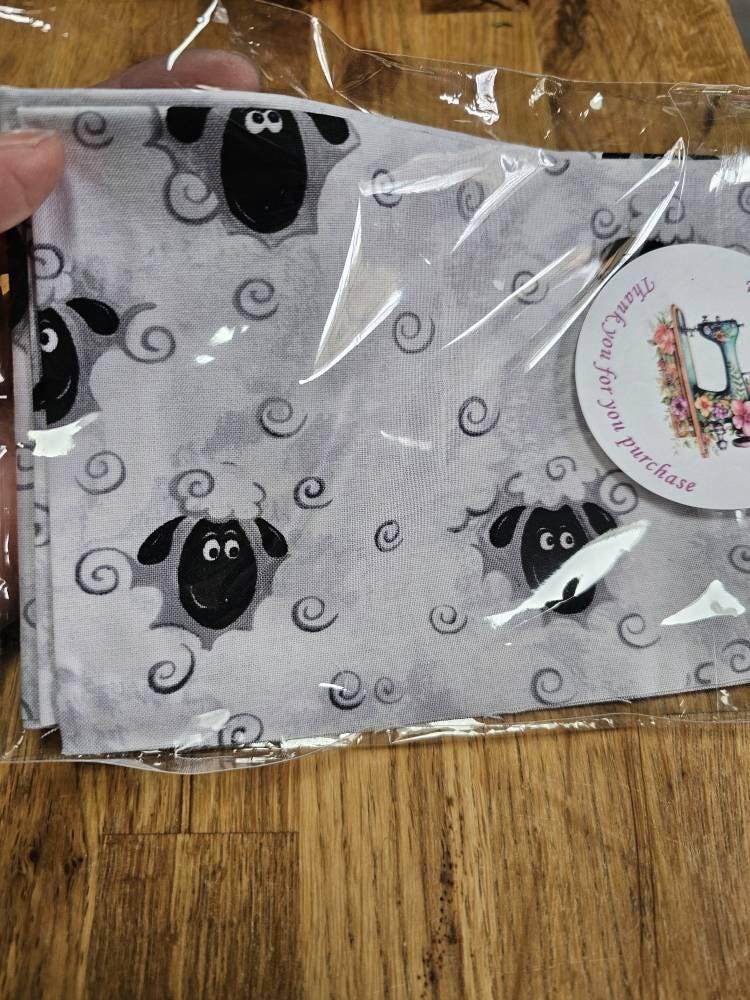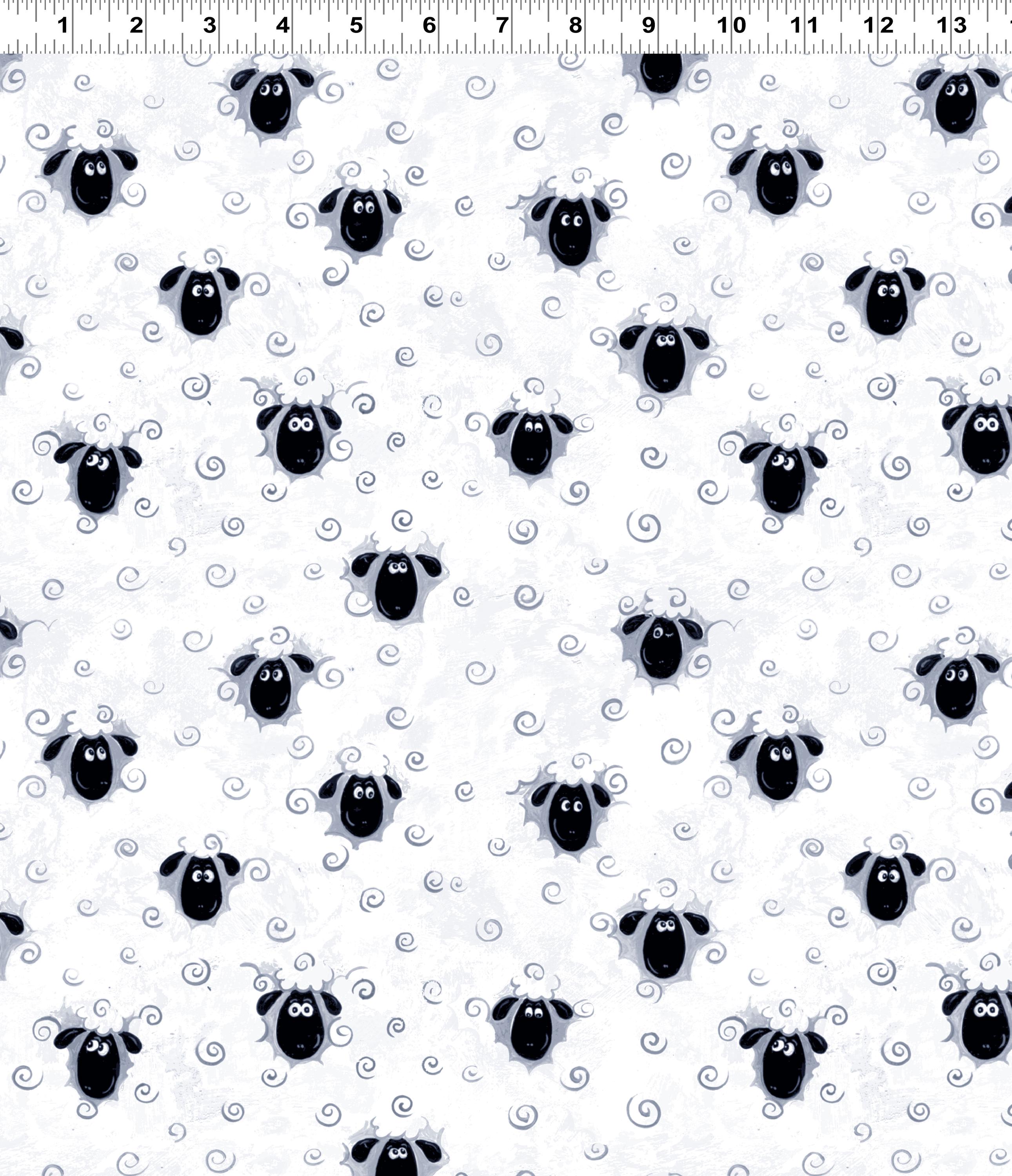 Soft white print featuring tiny tossed sheep heads and curly motifs, perfect for baby quilts, kids’ projects, and whimsical farmhouse sewing. The light, playful design works beautifully as a background, border, or blender with brighter feature prints.