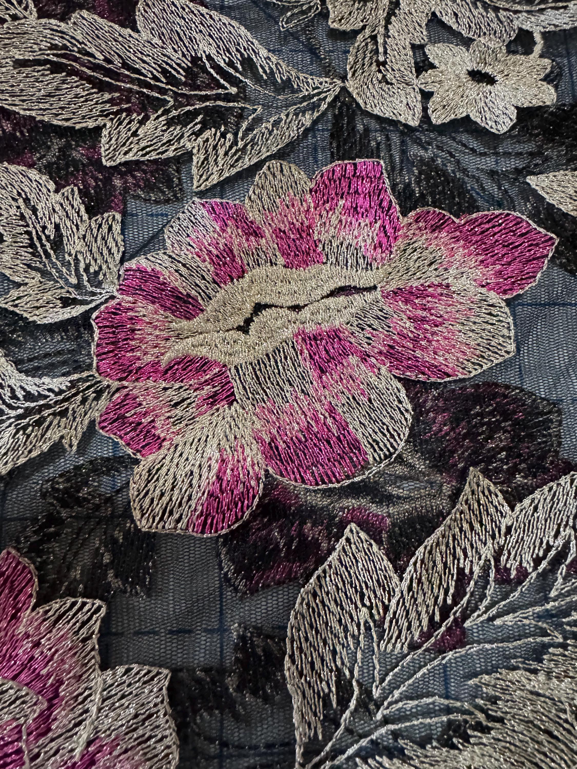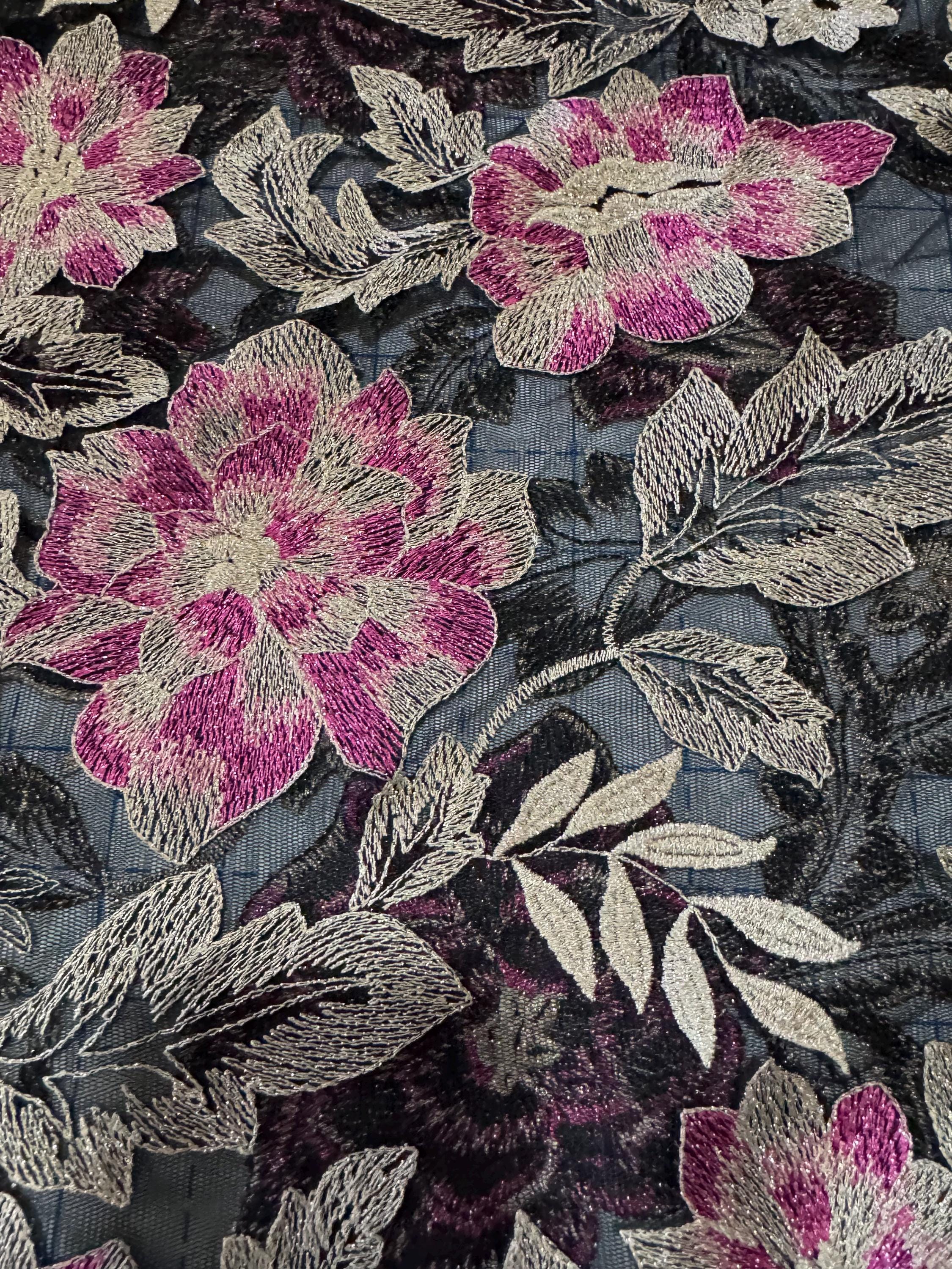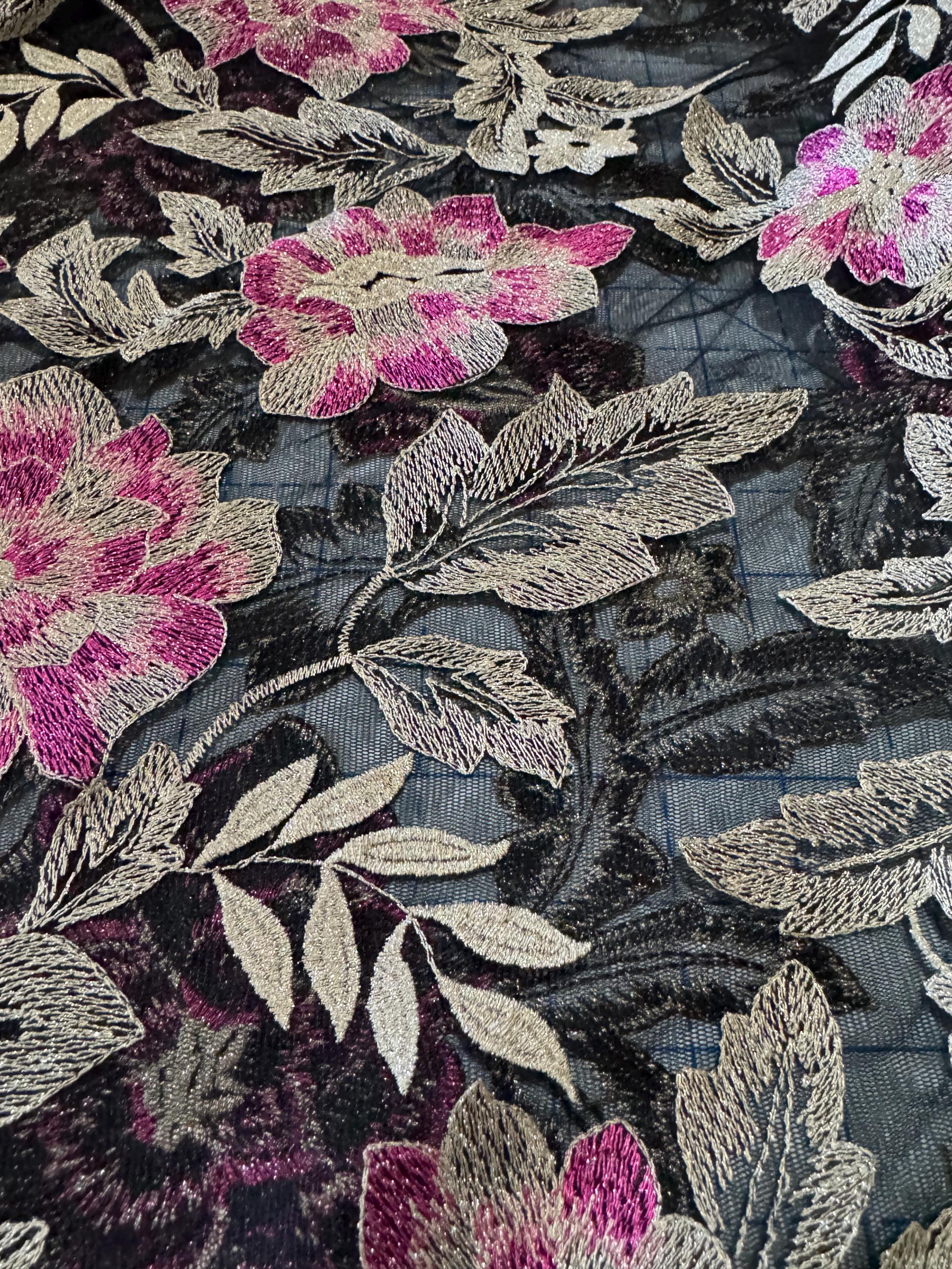 Stunning embroidered mesh fabric featuring metallic gold leaves and bold magenta roses on a dramatic black sheer background.