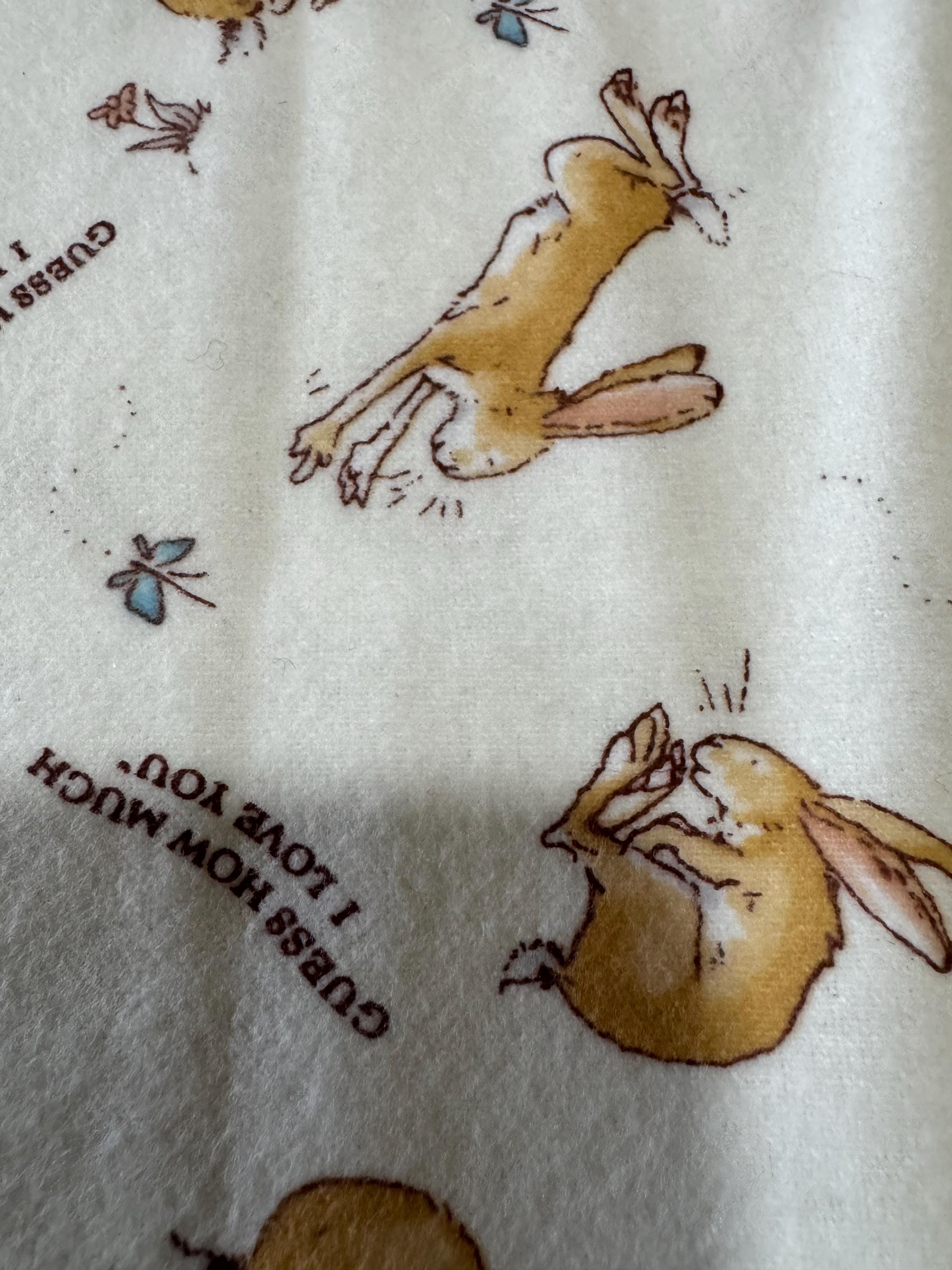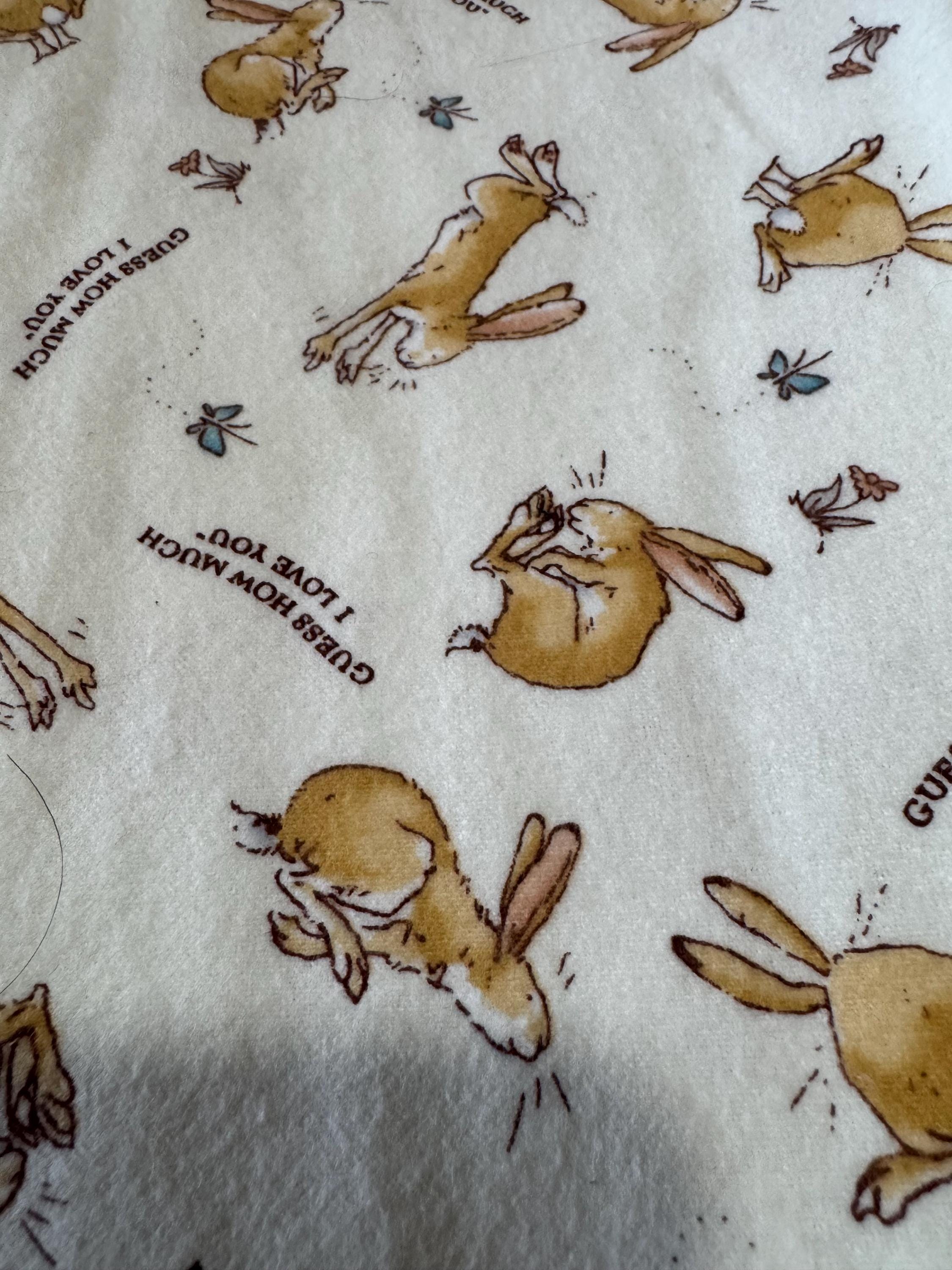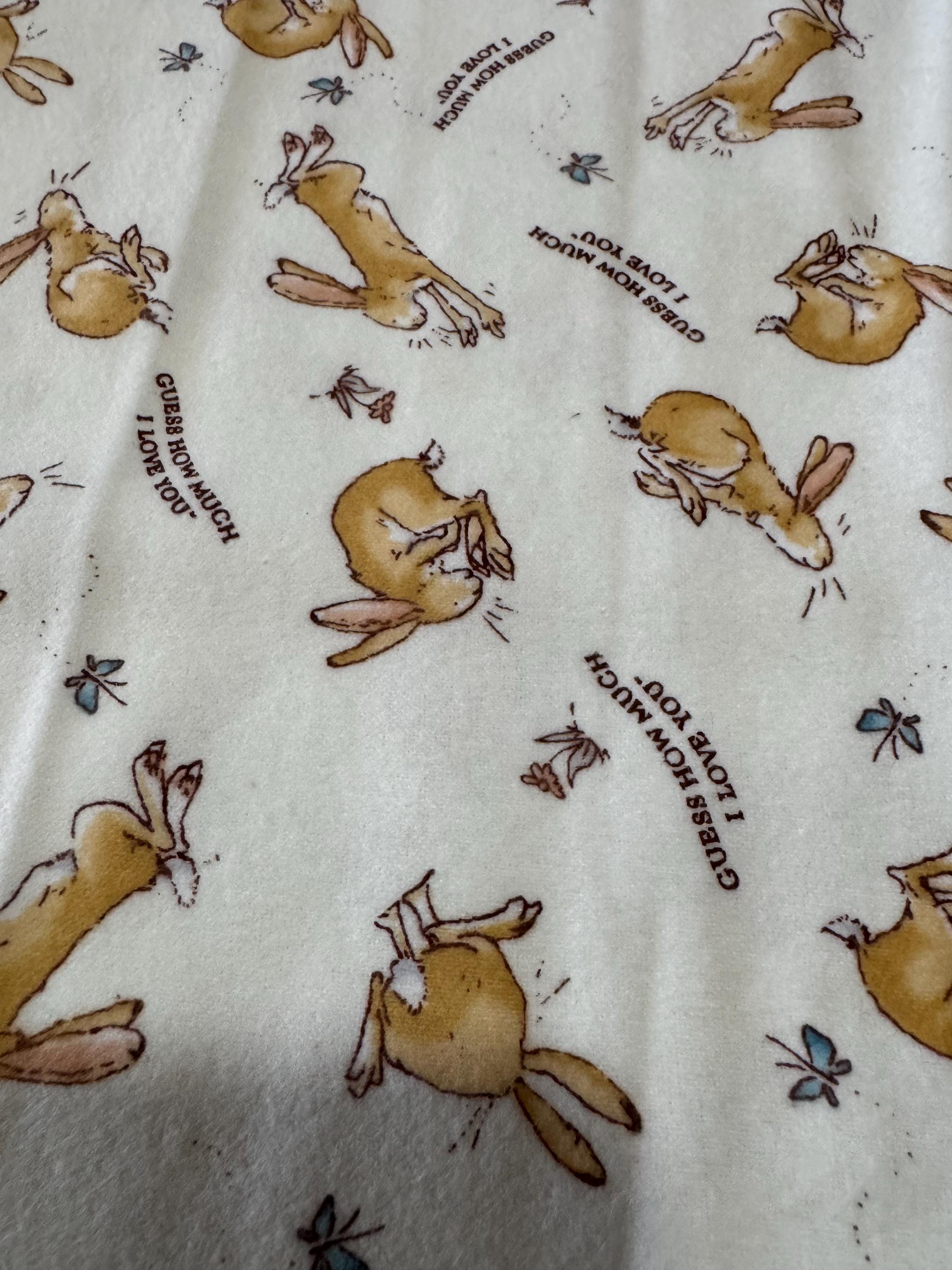 Wrap your little one in the sweetest comfort with this Guess How Much I Love You™ flannel from Clothworks. Featuring adorable bunnies, fluttering butterflies, and the classic phrase “Guess How Much I Love You”, this ultra-soft flannel is perfect for: