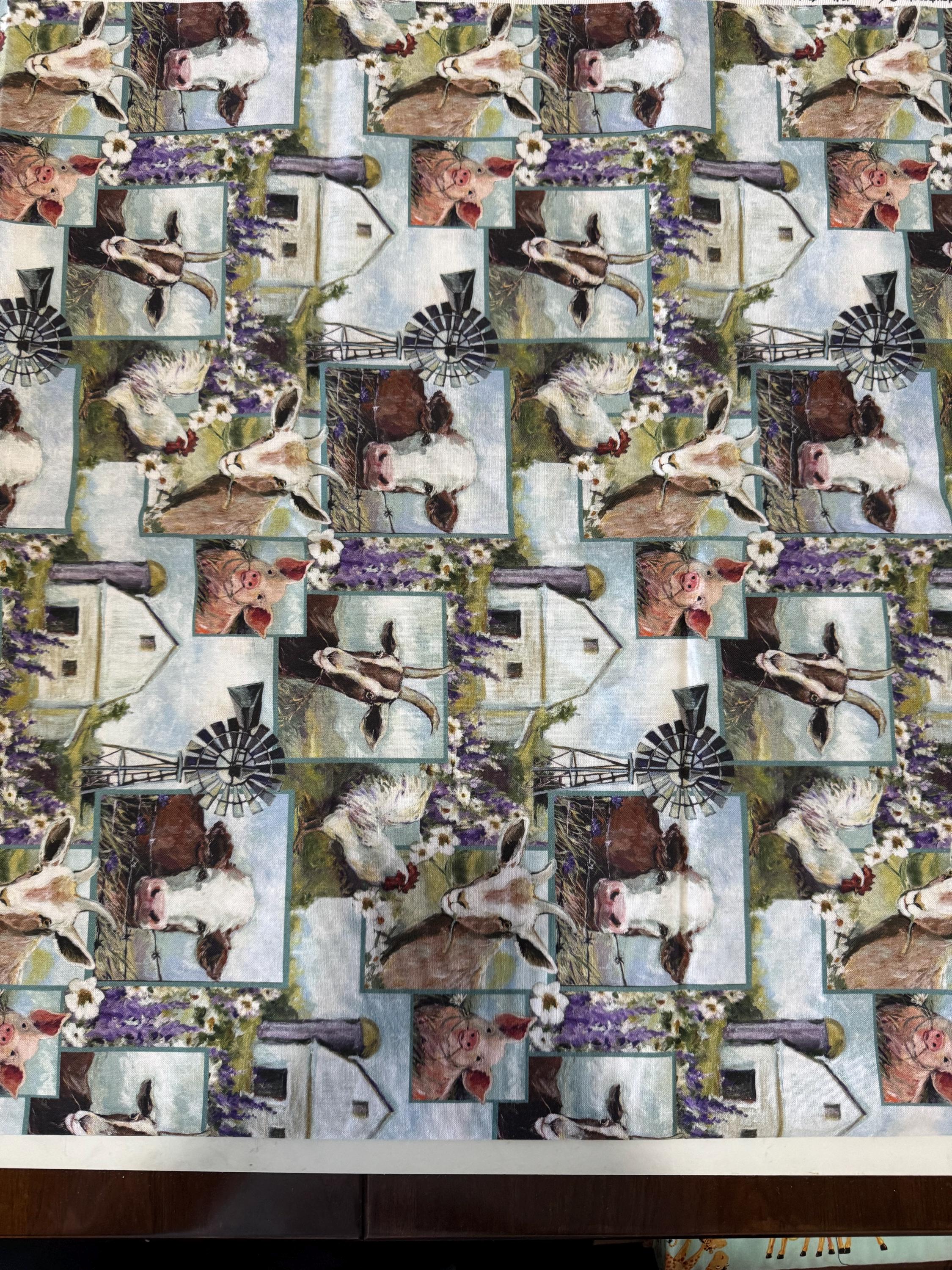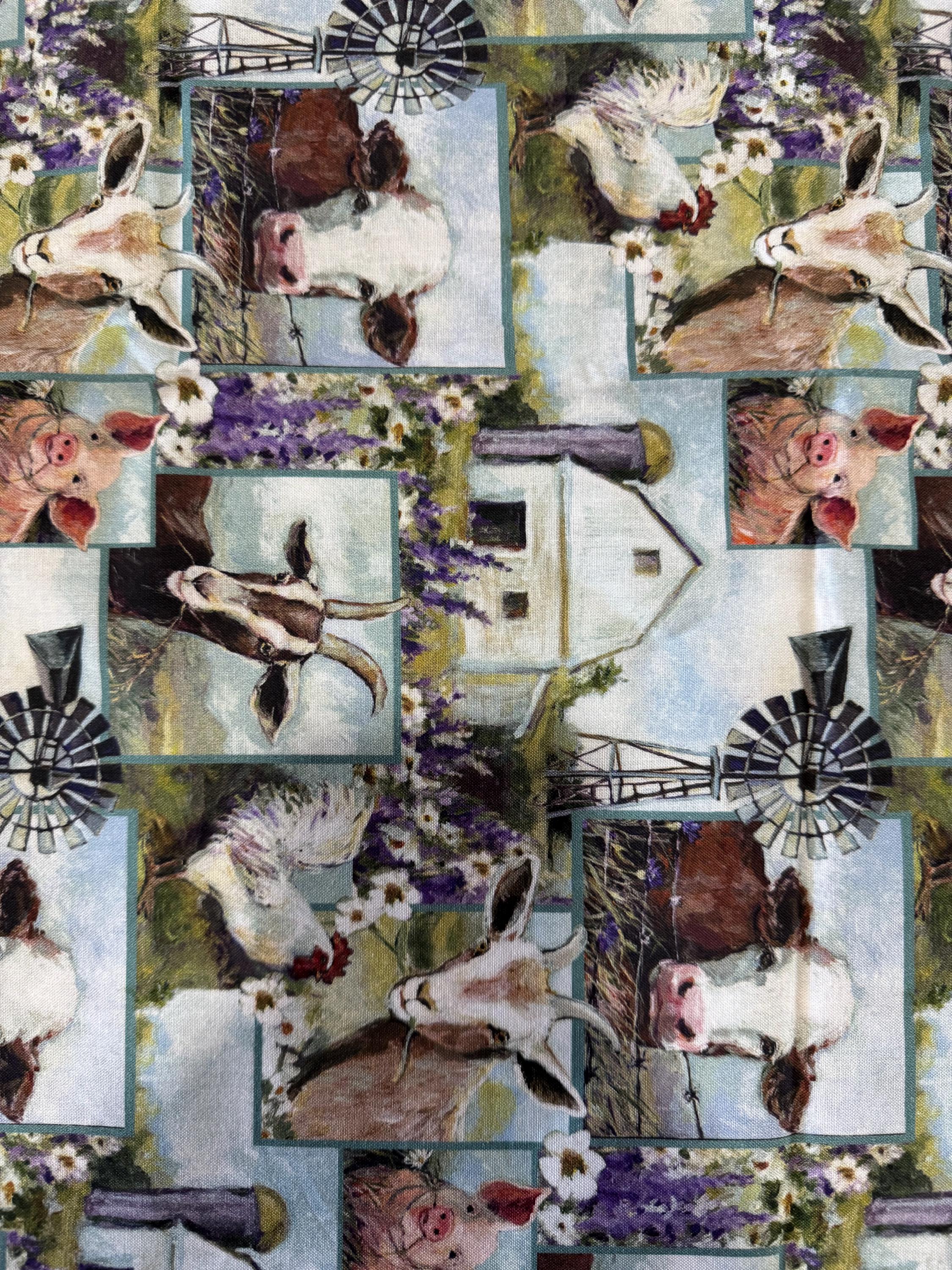 Bring the charm of the farm to your next sewing or quilting project with this beautiful Springs Creative CP80816 Meadowbrook fabric, featuring cows, pigs, chickens, goats, windmills, and barn scenes in a block-style layout.