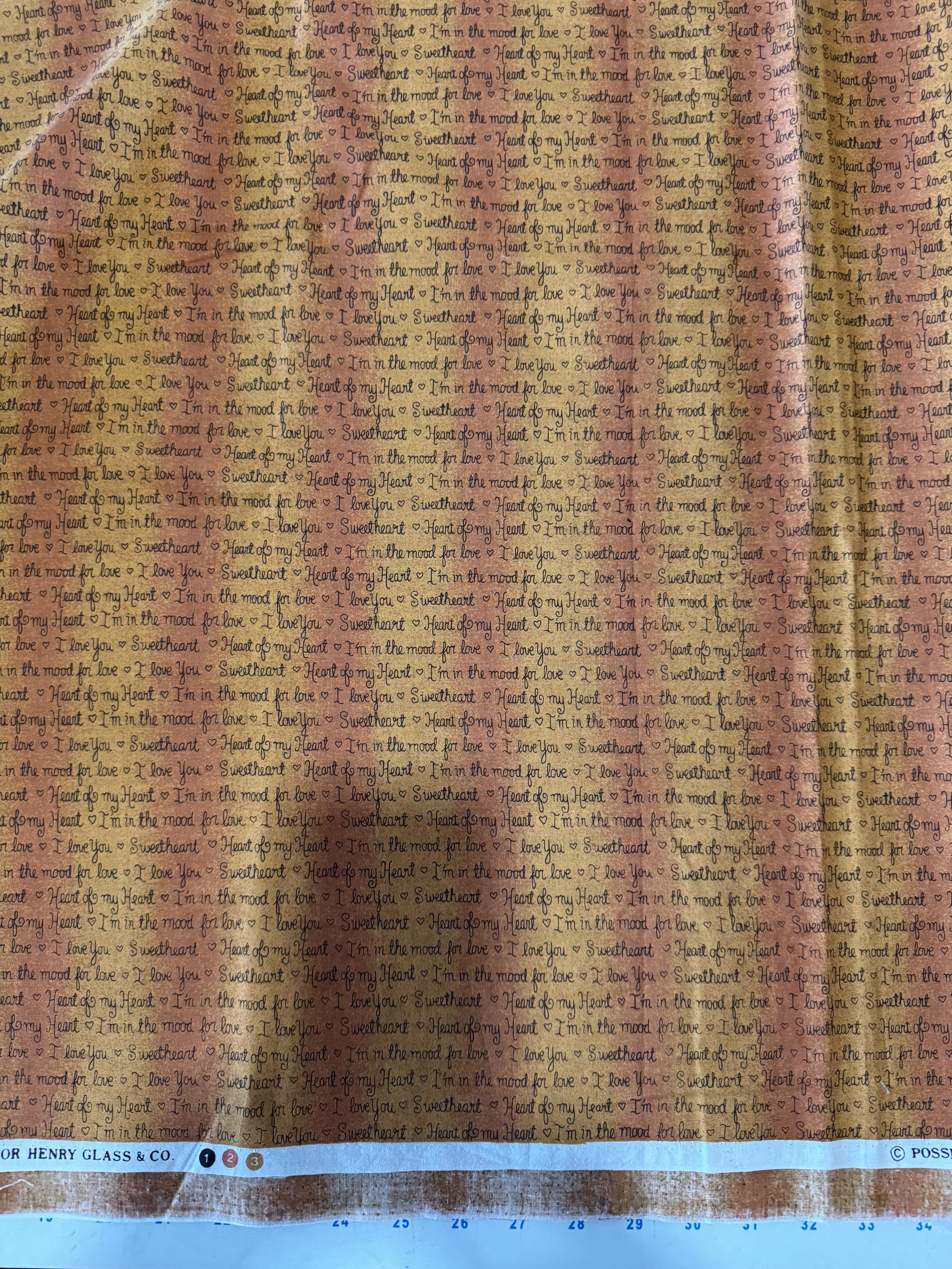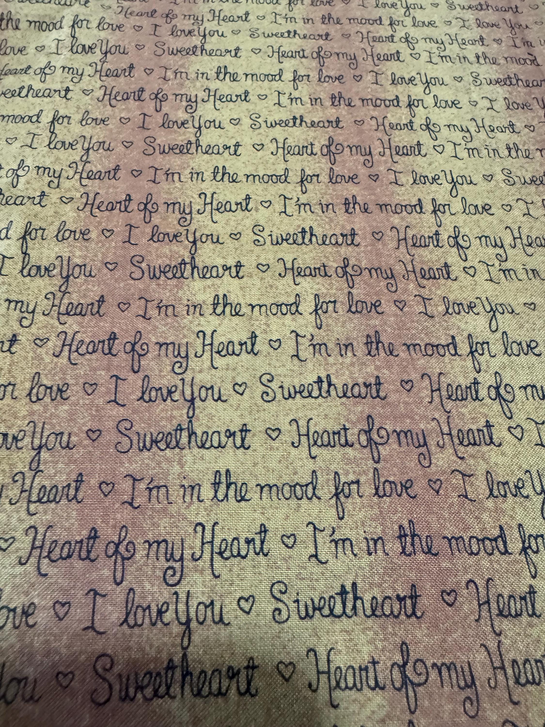 Add a touch of romance to your next sewing project with this sweet text-print fabric from Henry Glass & Co. Featuring handwritten script phrases such as “I love you,” “Sweetheart,” “Heart of My Heart,” and “I’m in the mood for love,” this warm tonal print blends soft shades of peach, rose, honey, and gold.