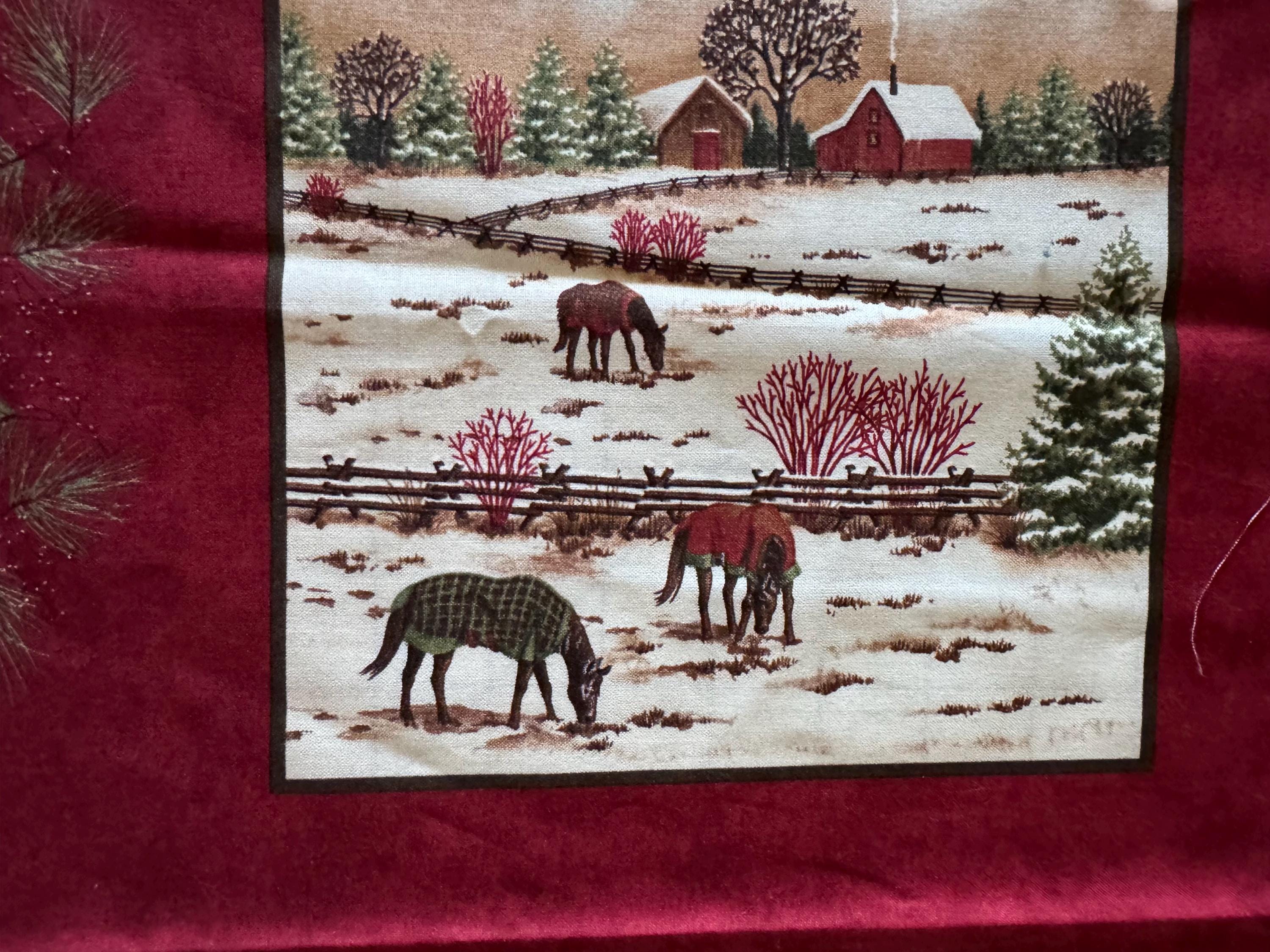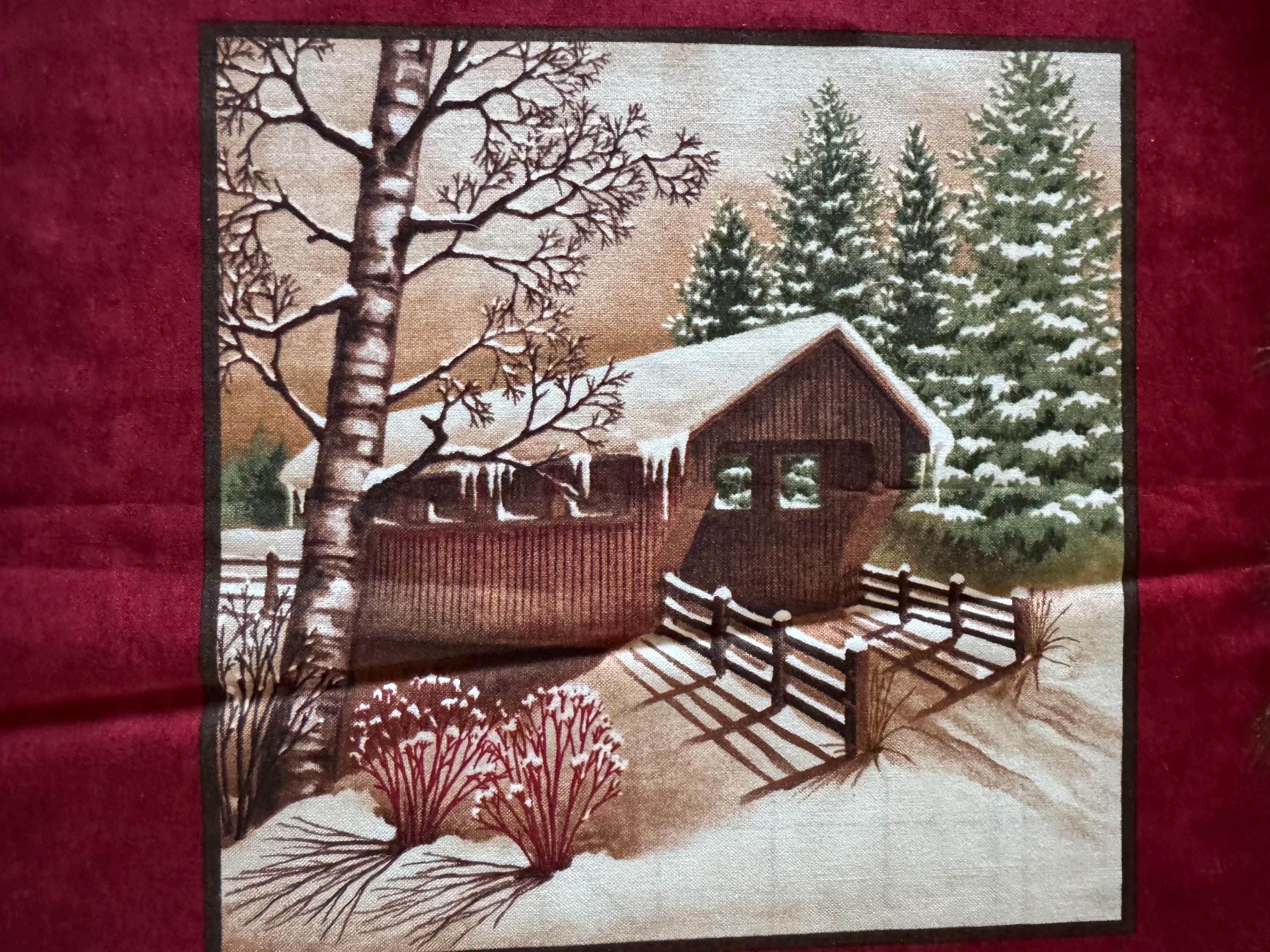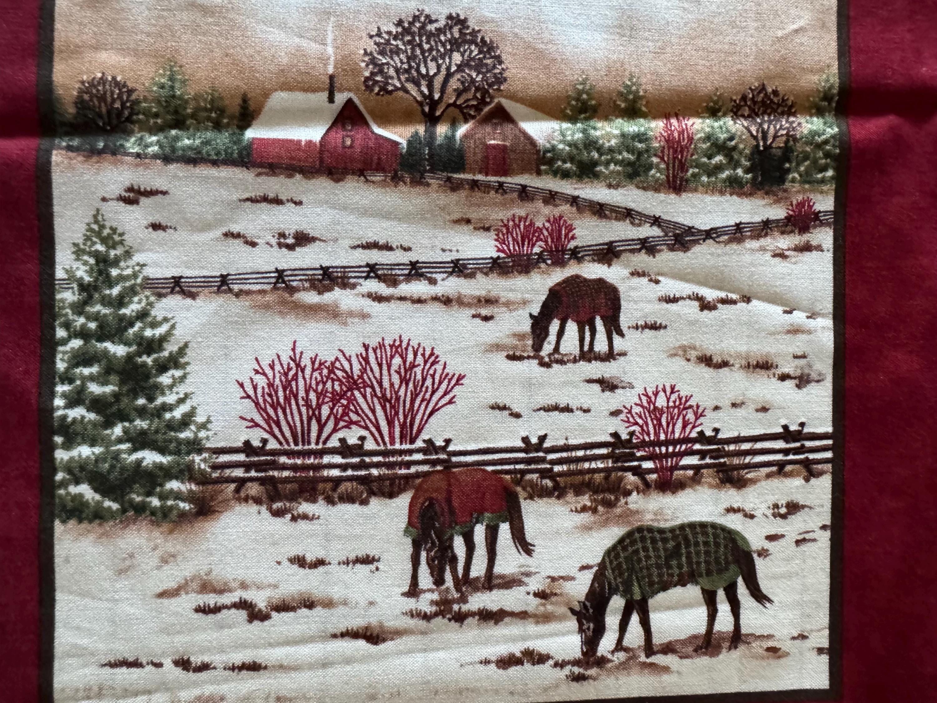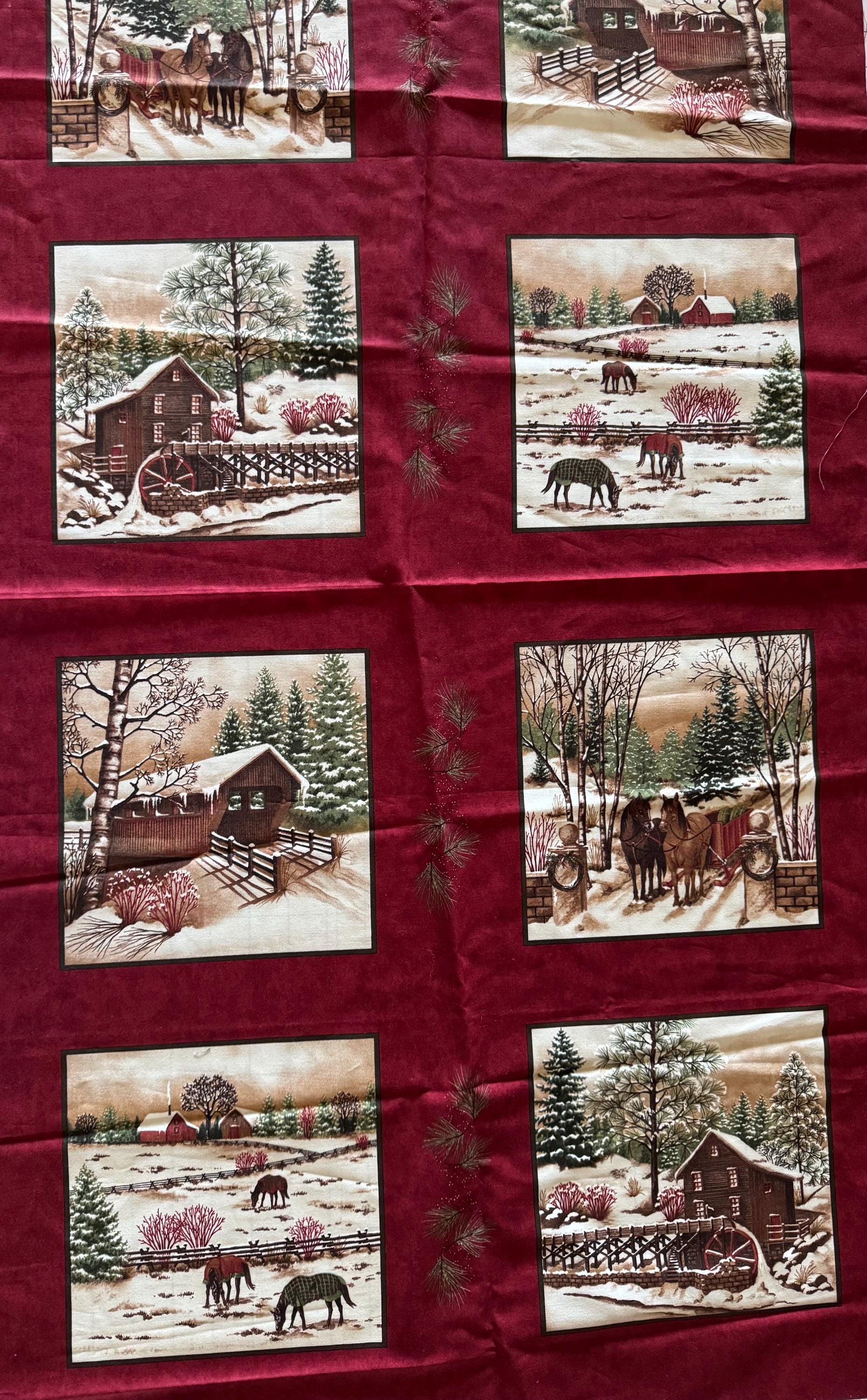 Featuring rustic winter barns, covered bridges, horses, evergreens, and soft red backgrounds, each block feels like a classic holiday postcard. Perfect for quilts, wall hangings, table runners, pillows, stockings, or farmhouse holiday décor.