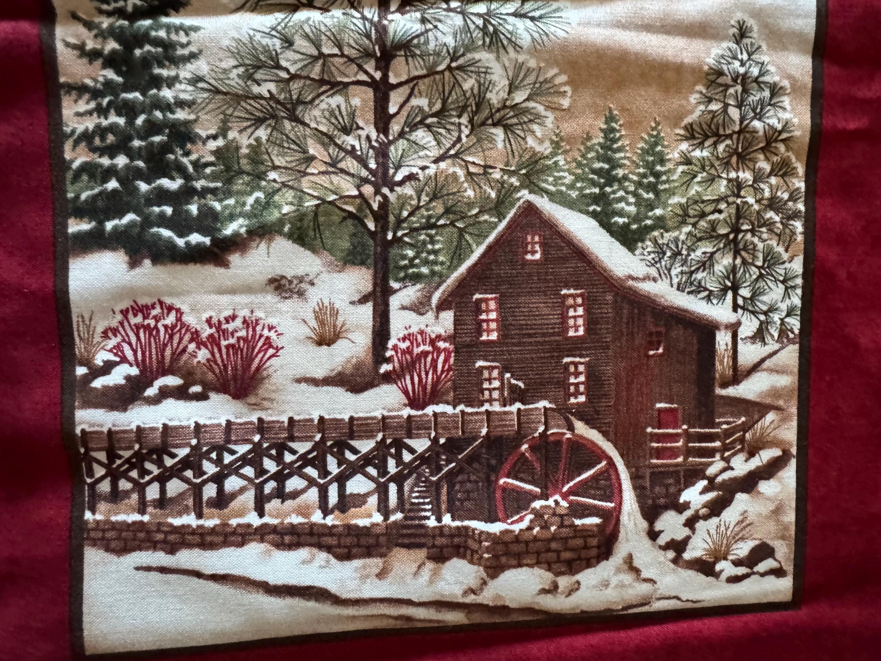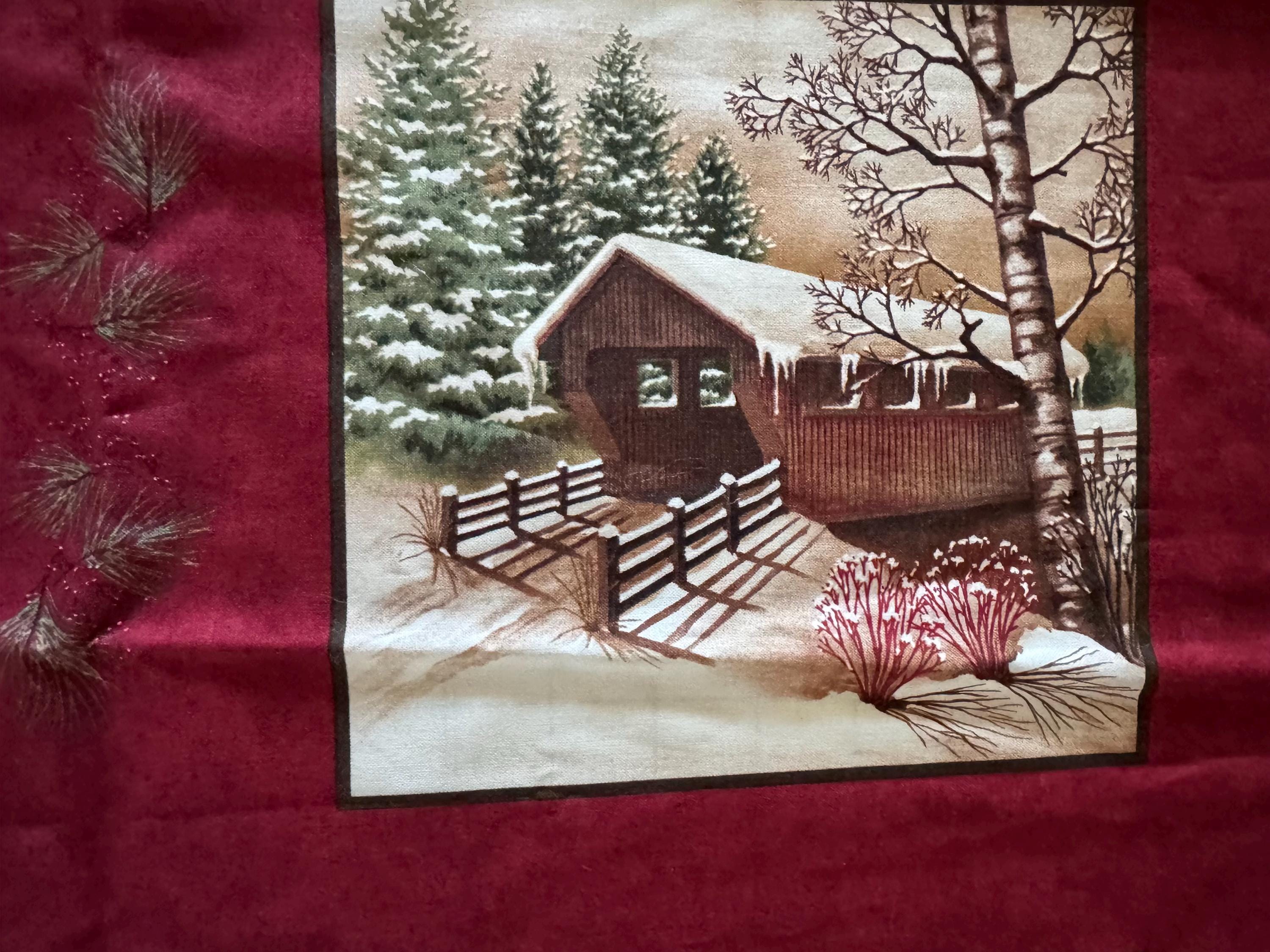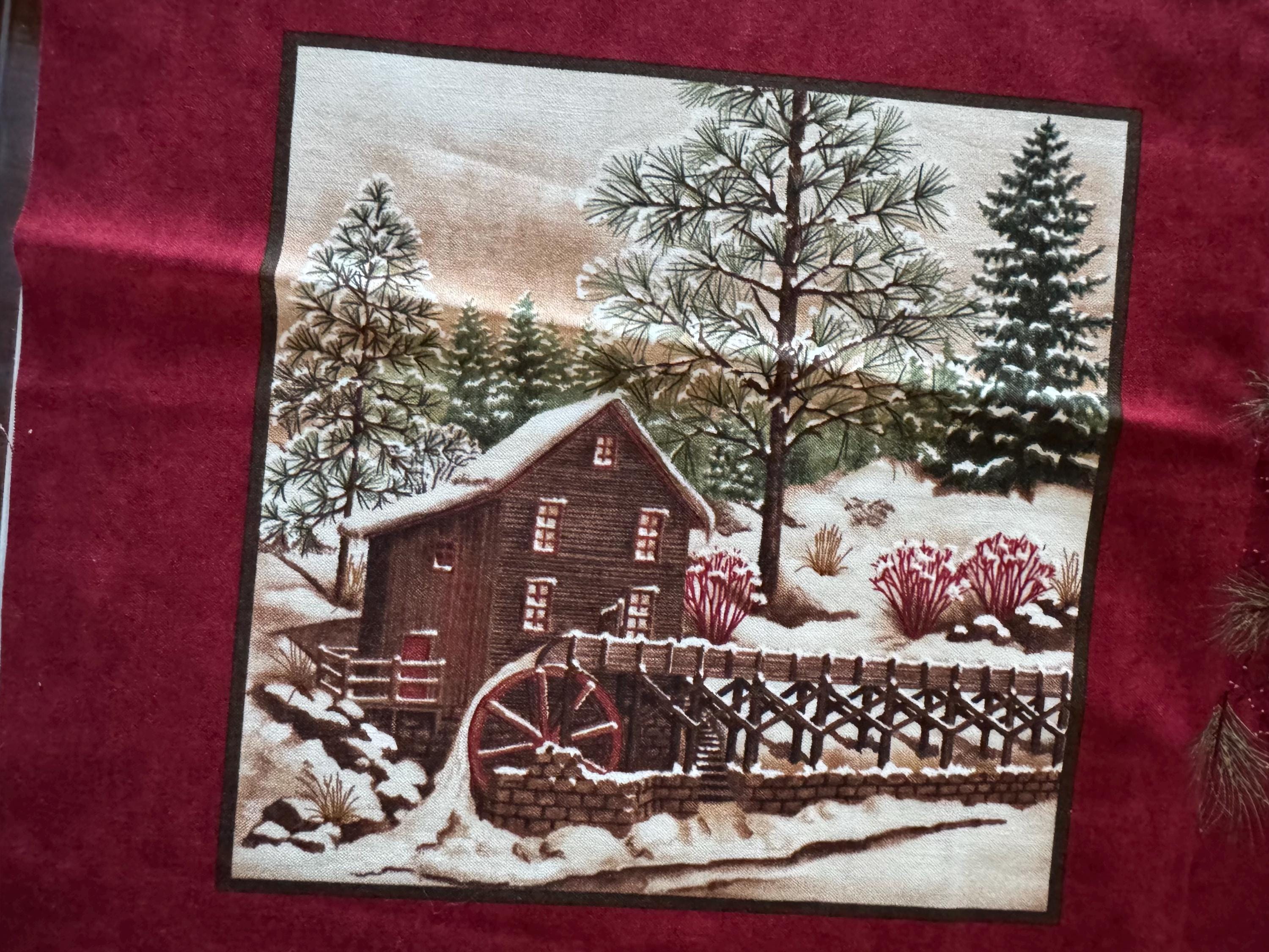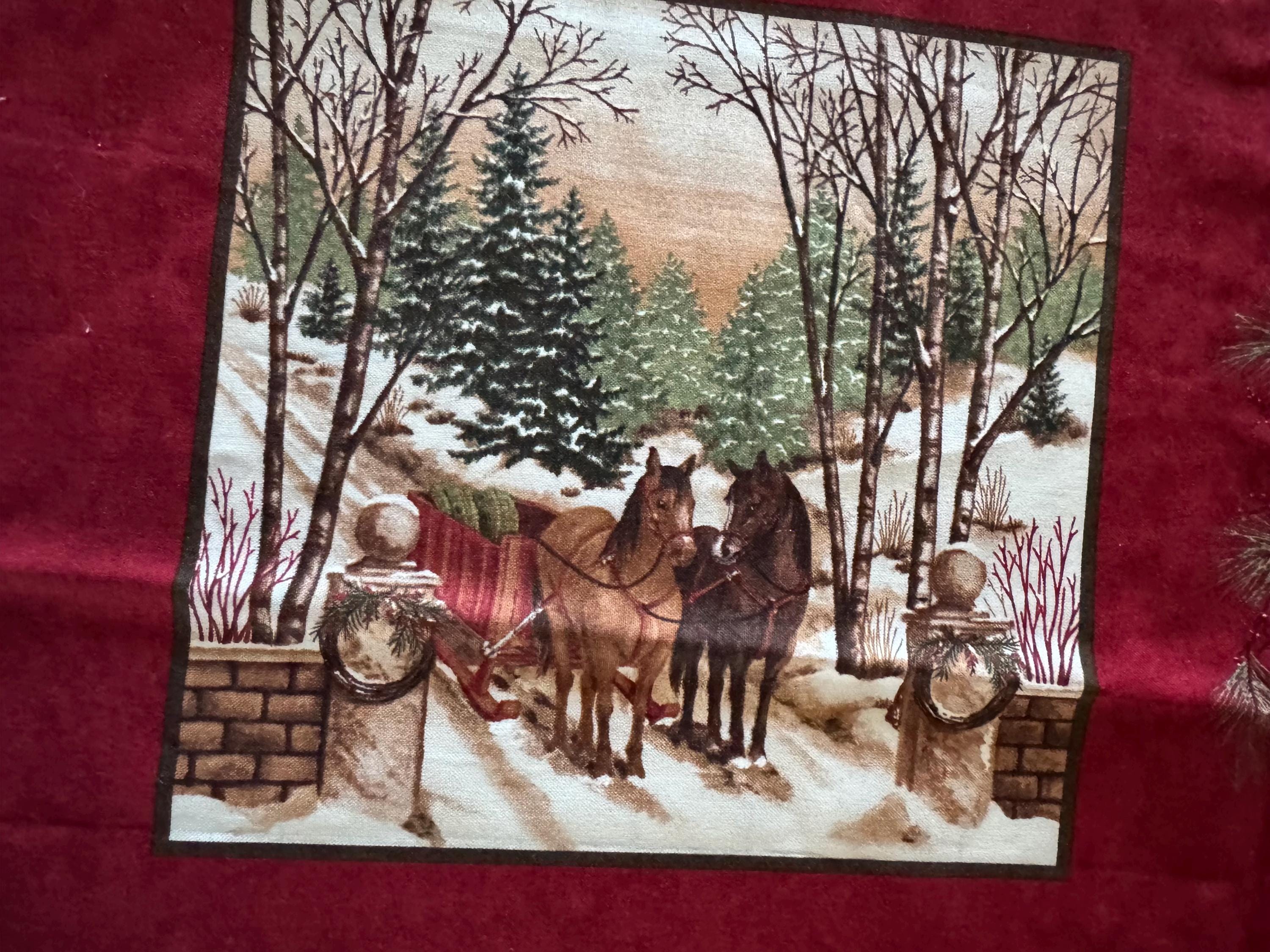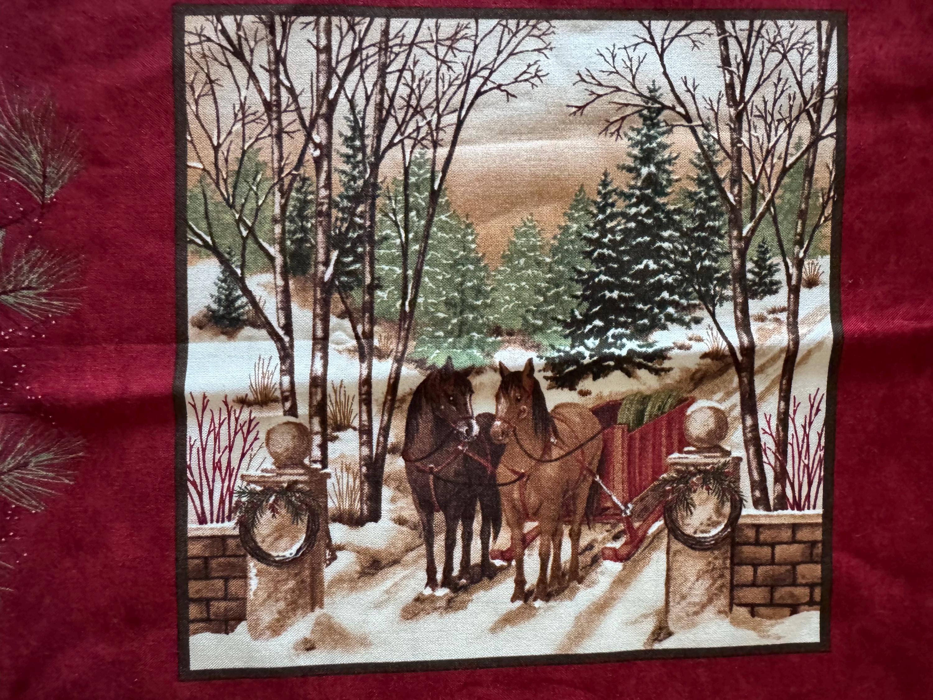 Featuring rustic winter barns, covered bridges, horses, evergreens, and soft red backgrounds, each block feels like a classic holiday postcard. Perfect for quilts, wall hangings, table runners, pillows, stockings, or farmhouse holiday décor.