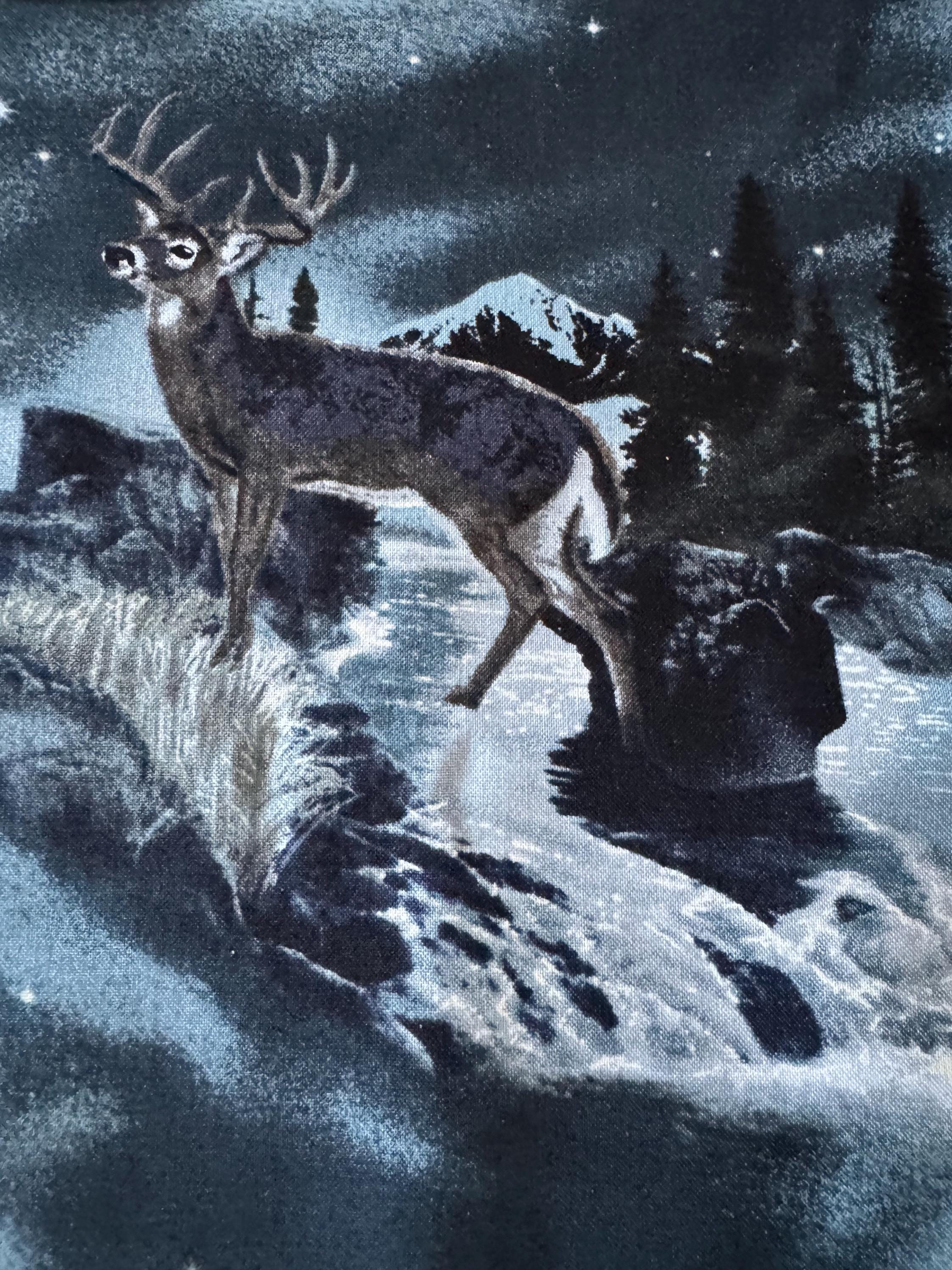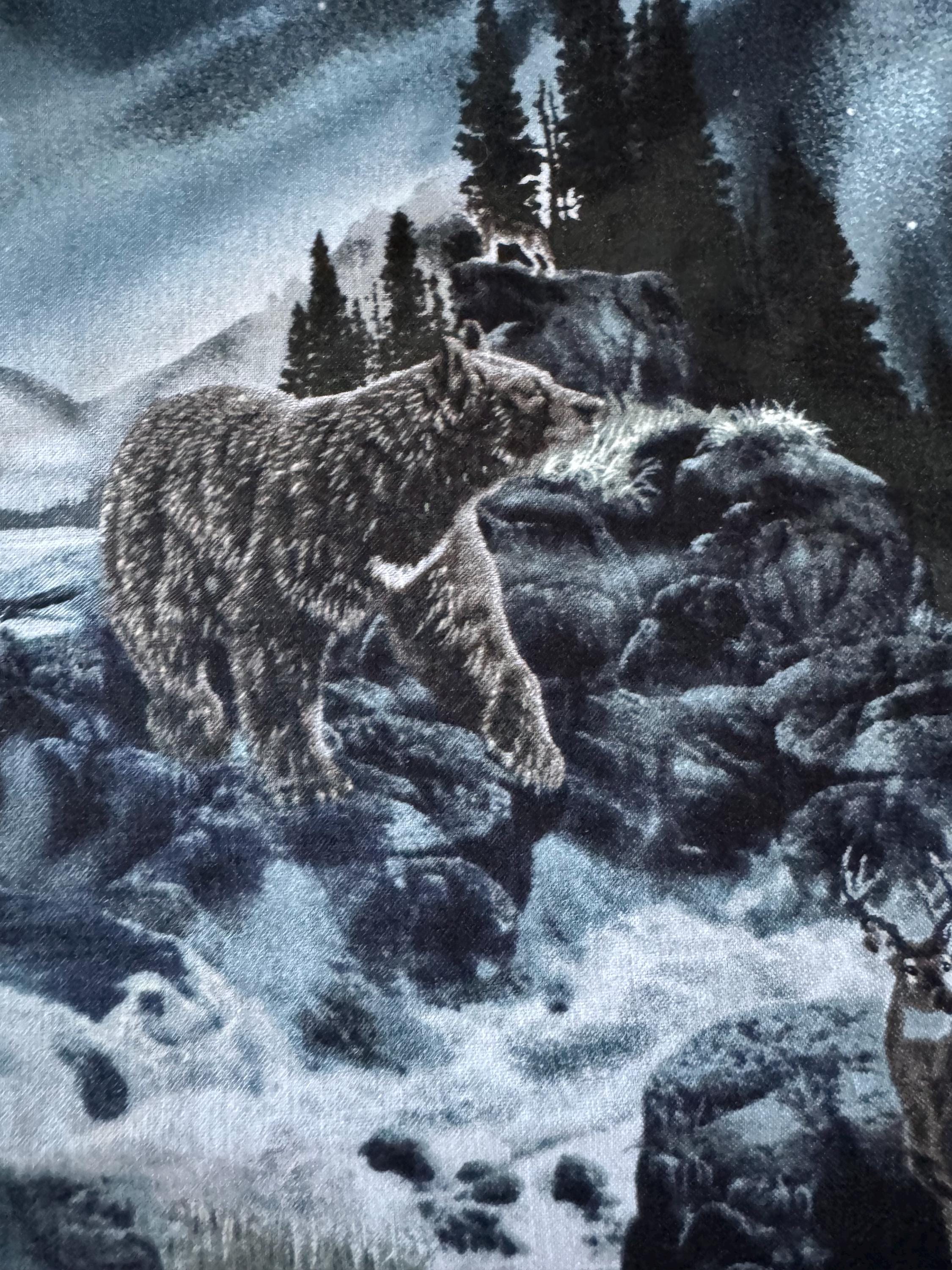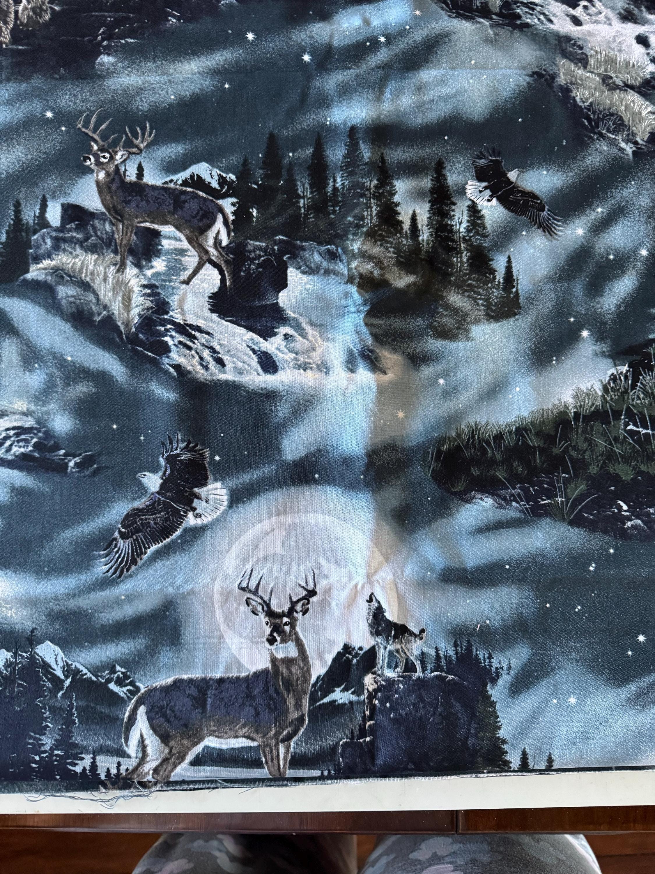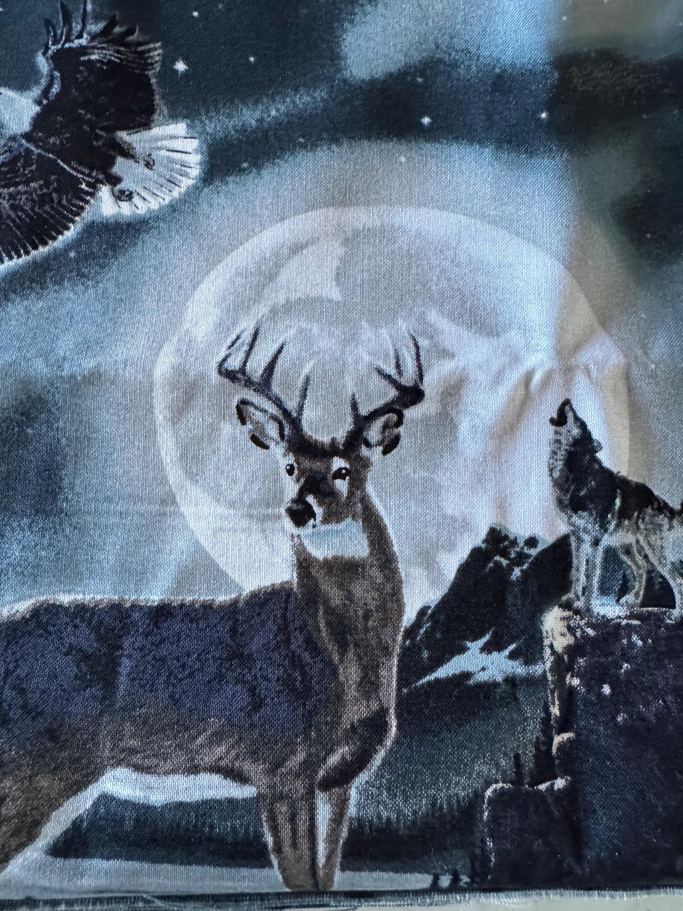 This stunning wildlife fabric features realistic deer, wolves, bears, eagles, pine trees, mountains, and a glowing full moon. The deep blue-black sky with snowy landscape creates a dramatic, moody scene perfect for: