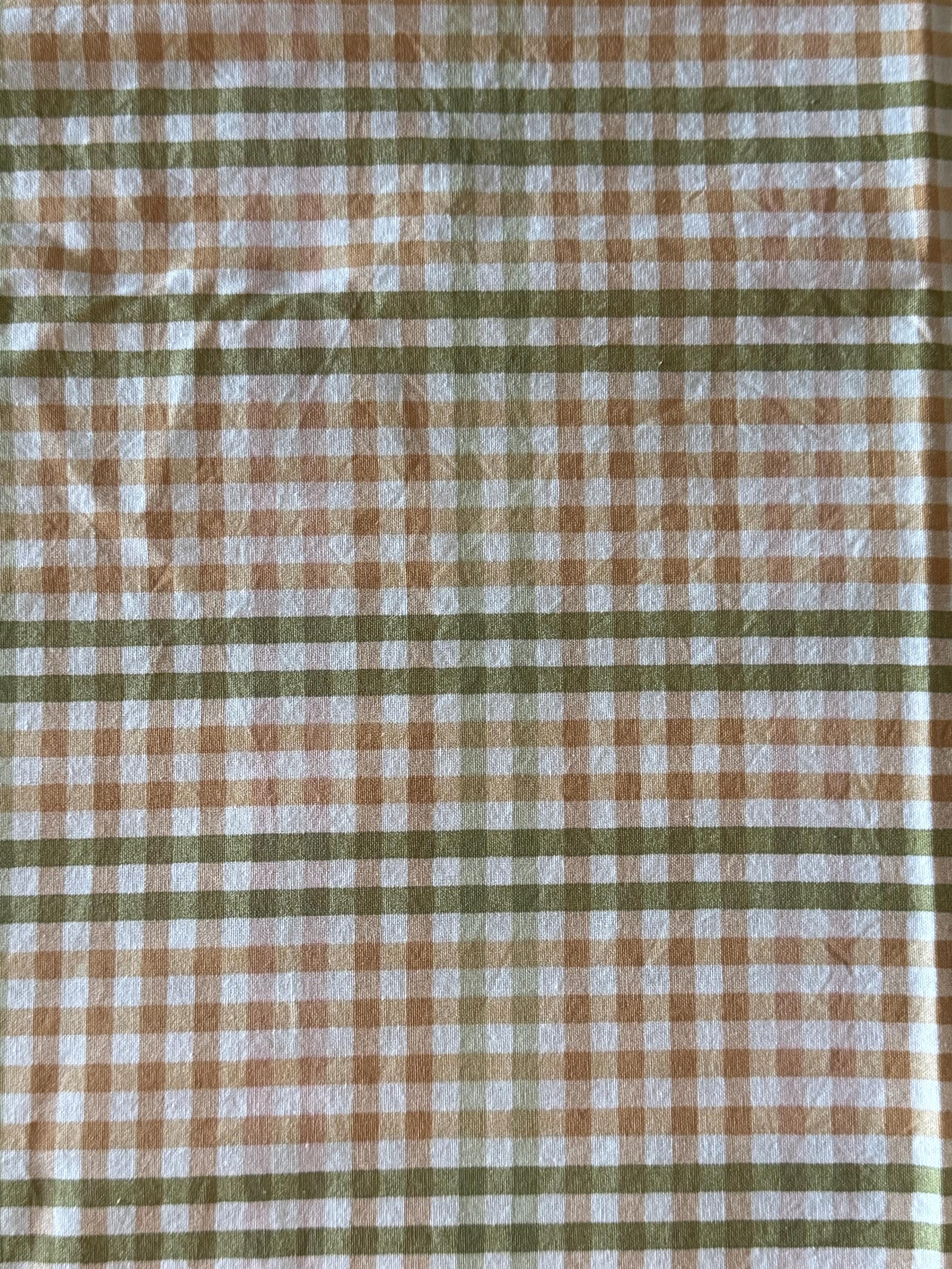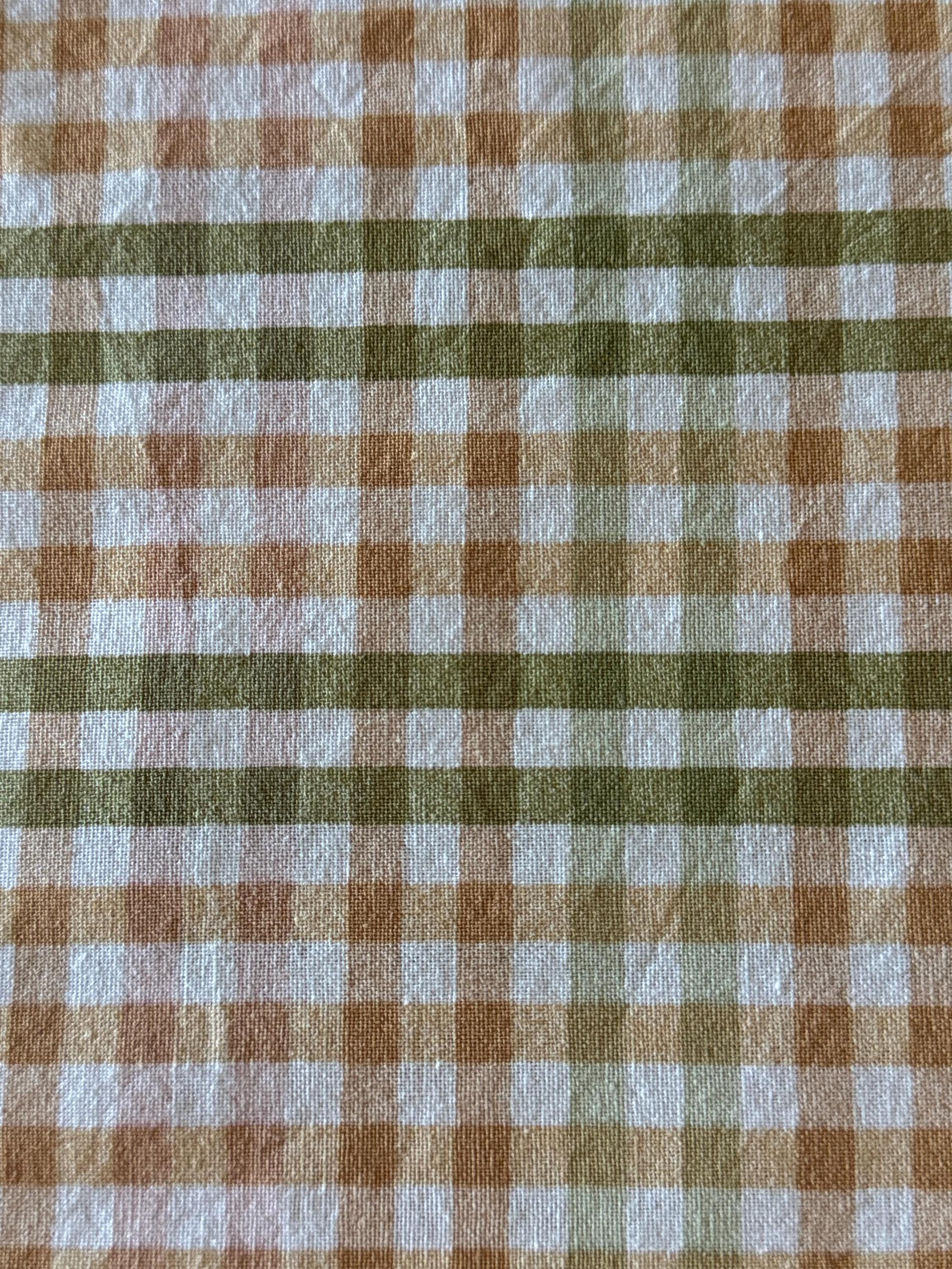 Bring a warm, rustic touch to your sewing projects with this olive and tan gingham check fabric. Featuring soft earthy tones of green, tan, and cream, this fabric works beautifully for farmhouse décor, table runners, kitchen towels, aprons, quilt accents, and primitive country-style crafts.