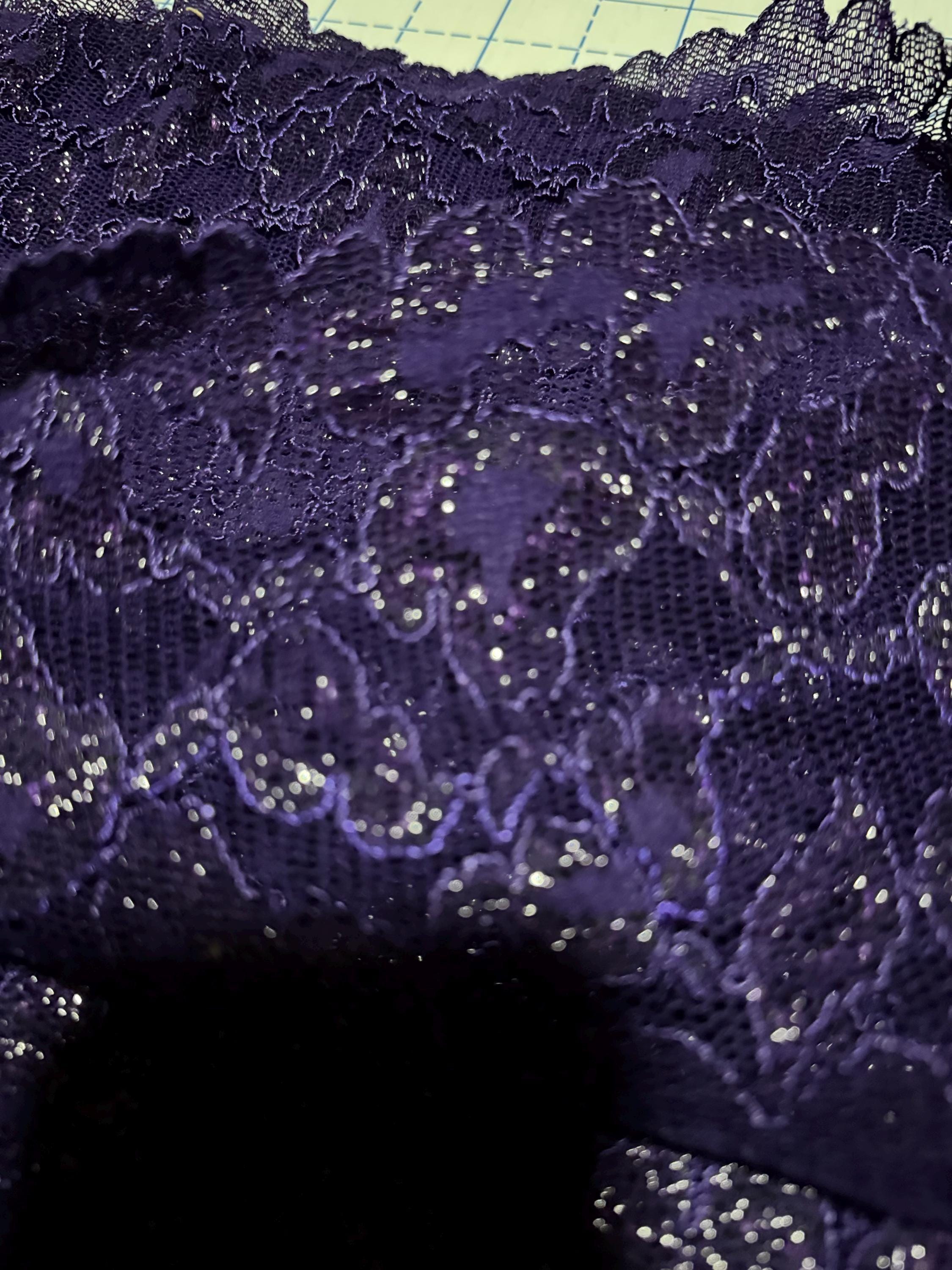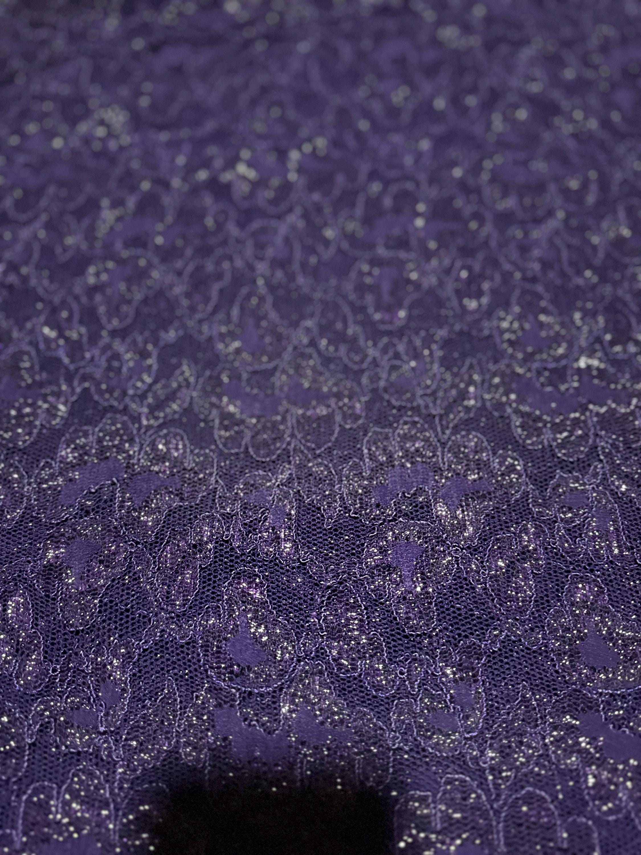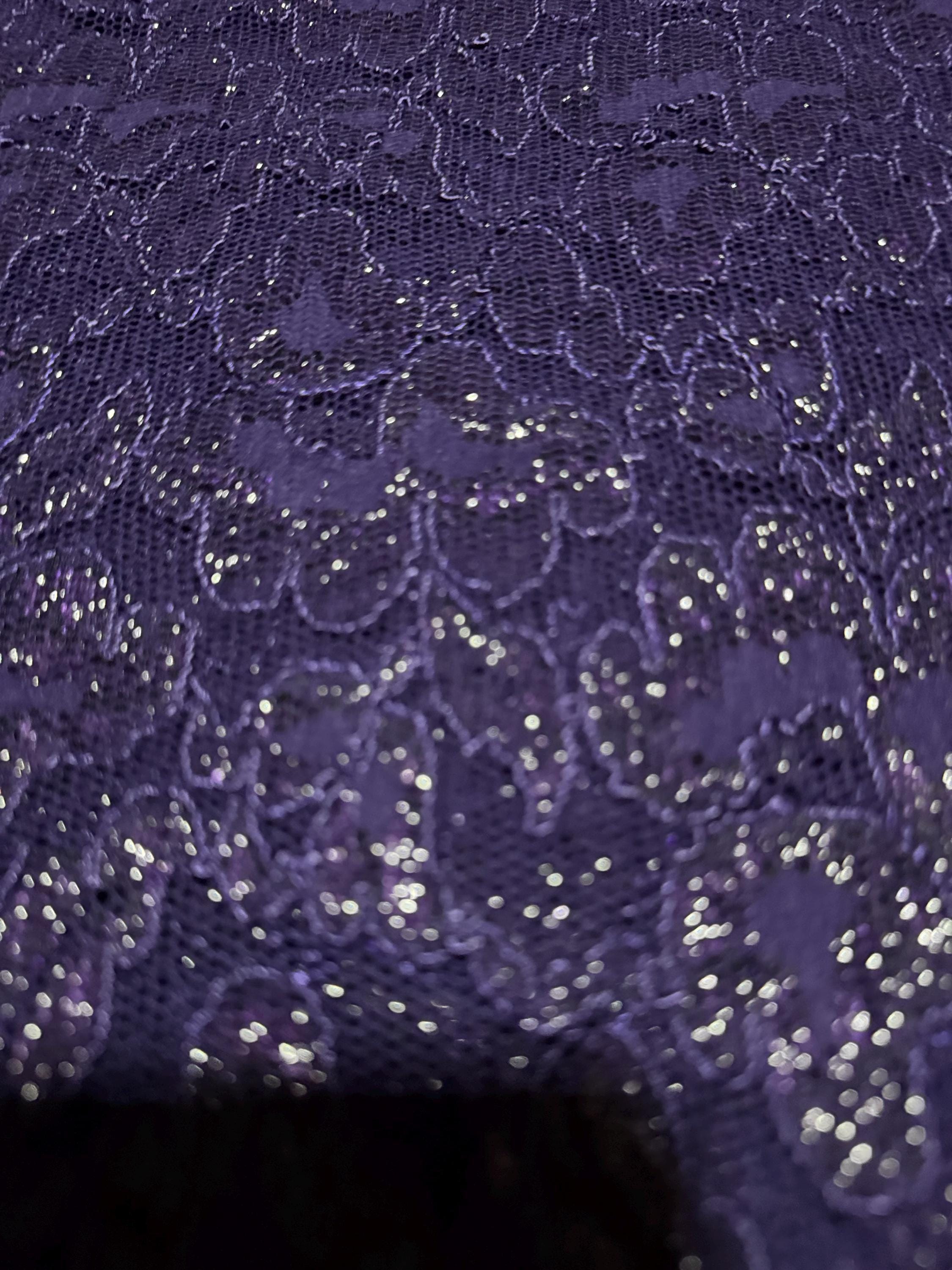 levate your special-occasion sewing with this stunning deep purple floral lace from Artvale. Featuring delicate floral motifs woven into a soft mesh base, this lace is enhanced with subtle metallic sparkle that catches the light beautifully. Perfect for evening wear, dance costumes, overlays, formal gowns, accessories, or elegant décor accents.
