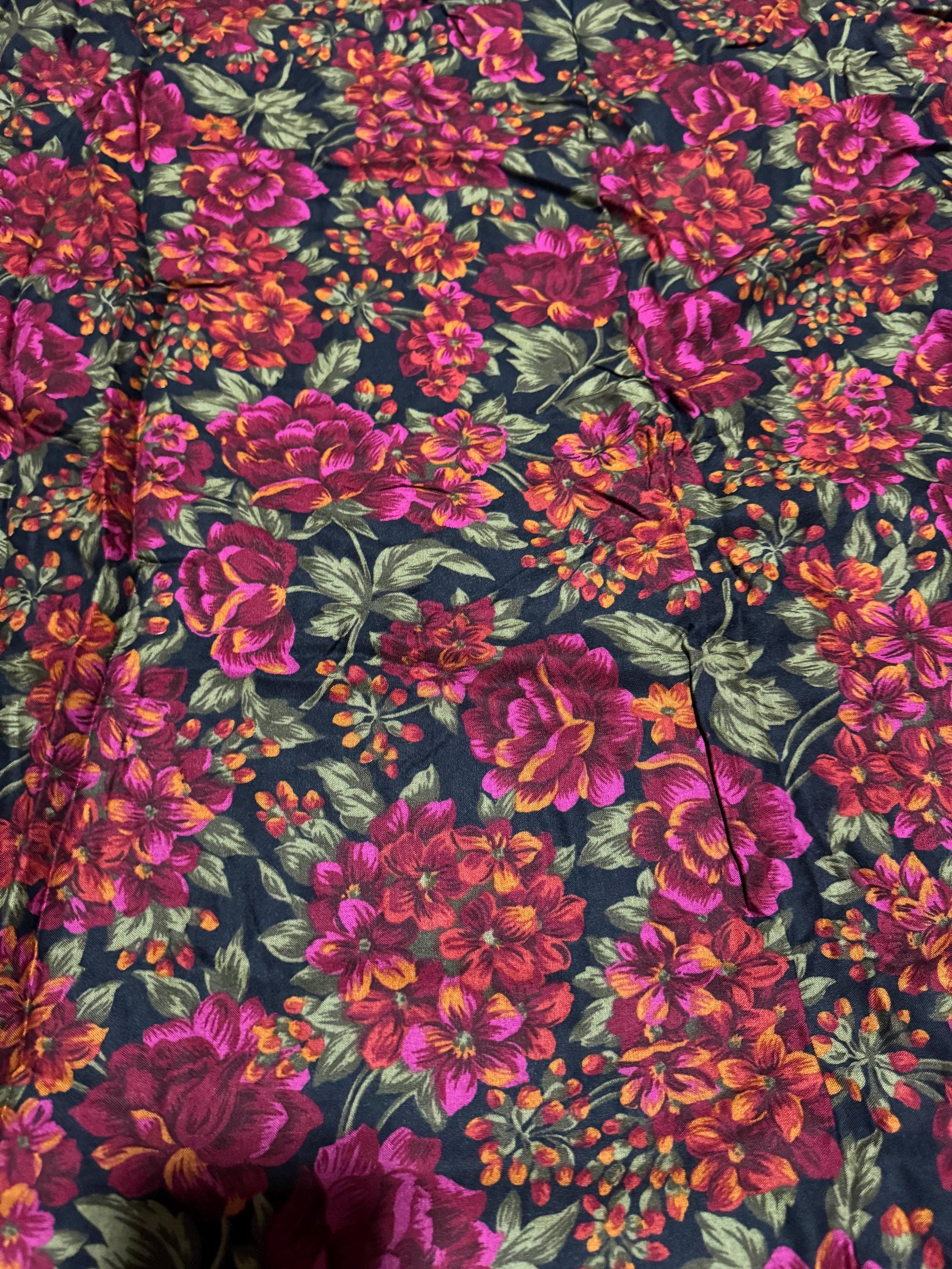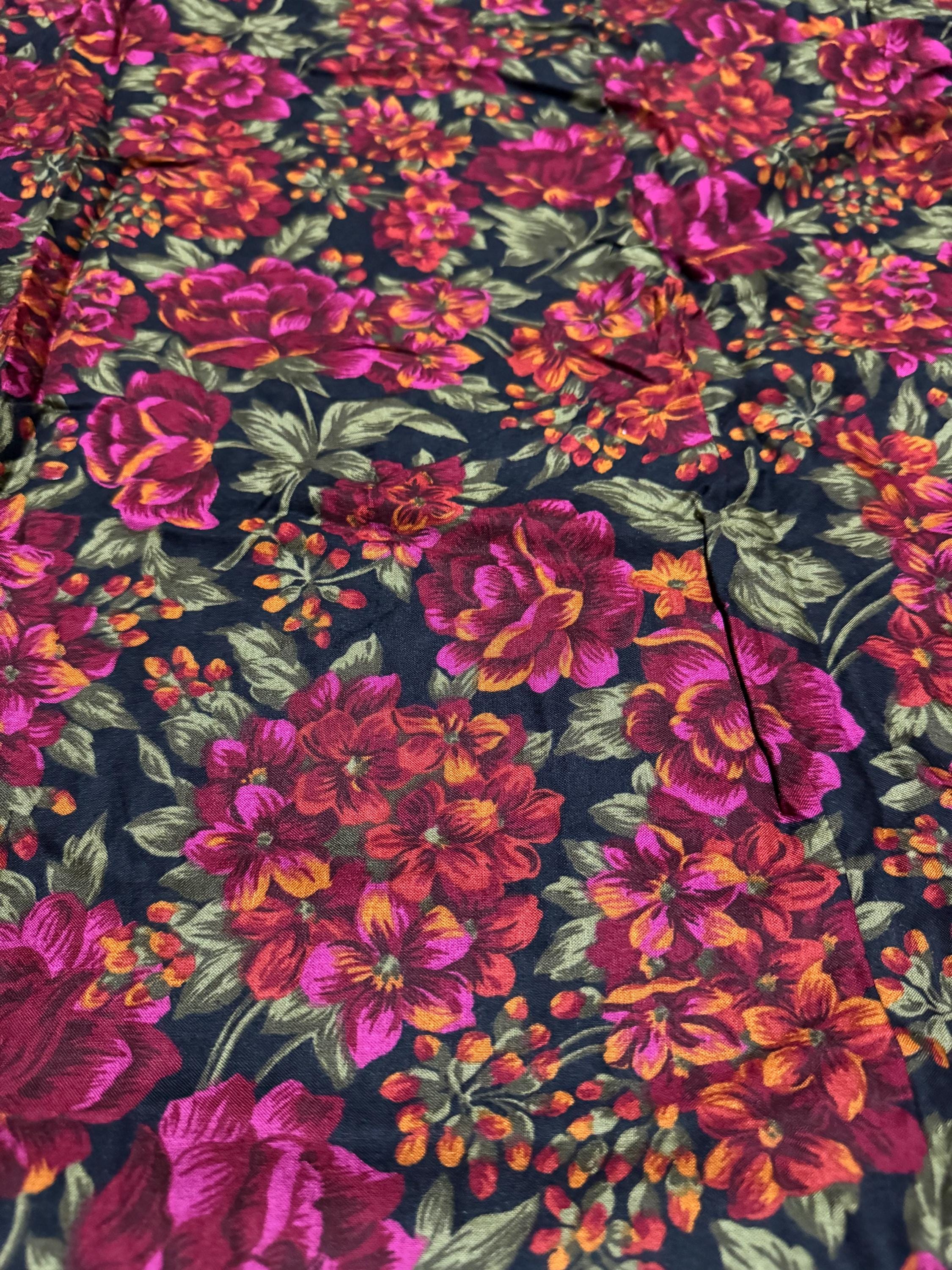 Bring richness and elegance to your next sewing project with this stunning deep-toned floral cotton. Saturated shades of red, magenta, raspberry, and warm orange pop beautifully against the black background, creating a lush bouquet effect. Perfect for quilts, apparel, bags, table runners, and fall-inspired projects. The print is bold, warm, and incredibly eye-catching — ideal for statement pieces or coordinated accents.