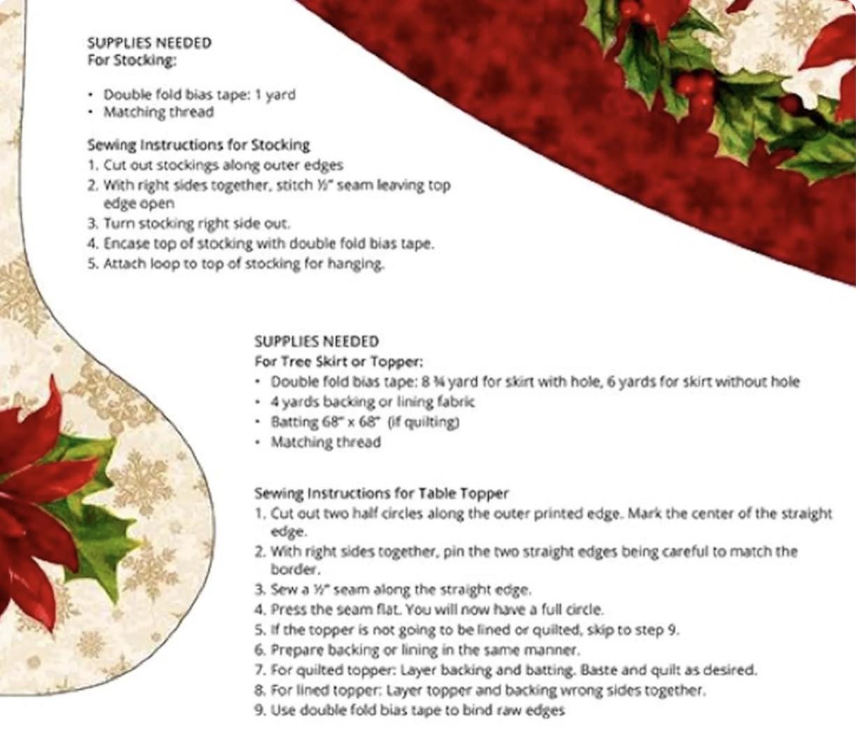 This festive cotton fabric panel features a stunning poinsettia design that allows you to sew a half poinsettia tree skirt and a coordinating Christmas stocking. Rich holiday colors and elegant floral details make this a timeless addition to your Christmas décor.