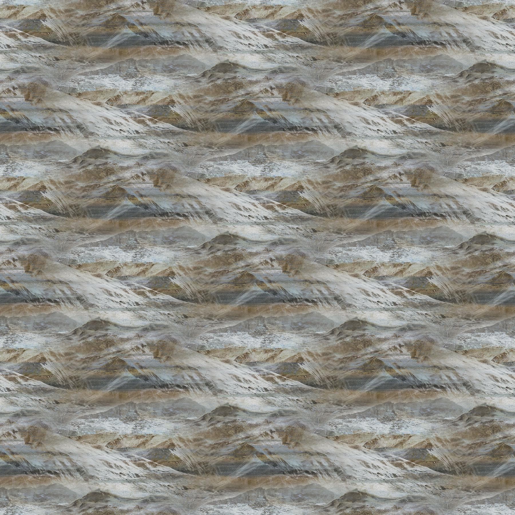 The centerpiece panel highlights powerful horses in motion, while coordinating prints in blues, creams, grays, taupes, and browns create depth and harmony for a complete quilt or décor project.