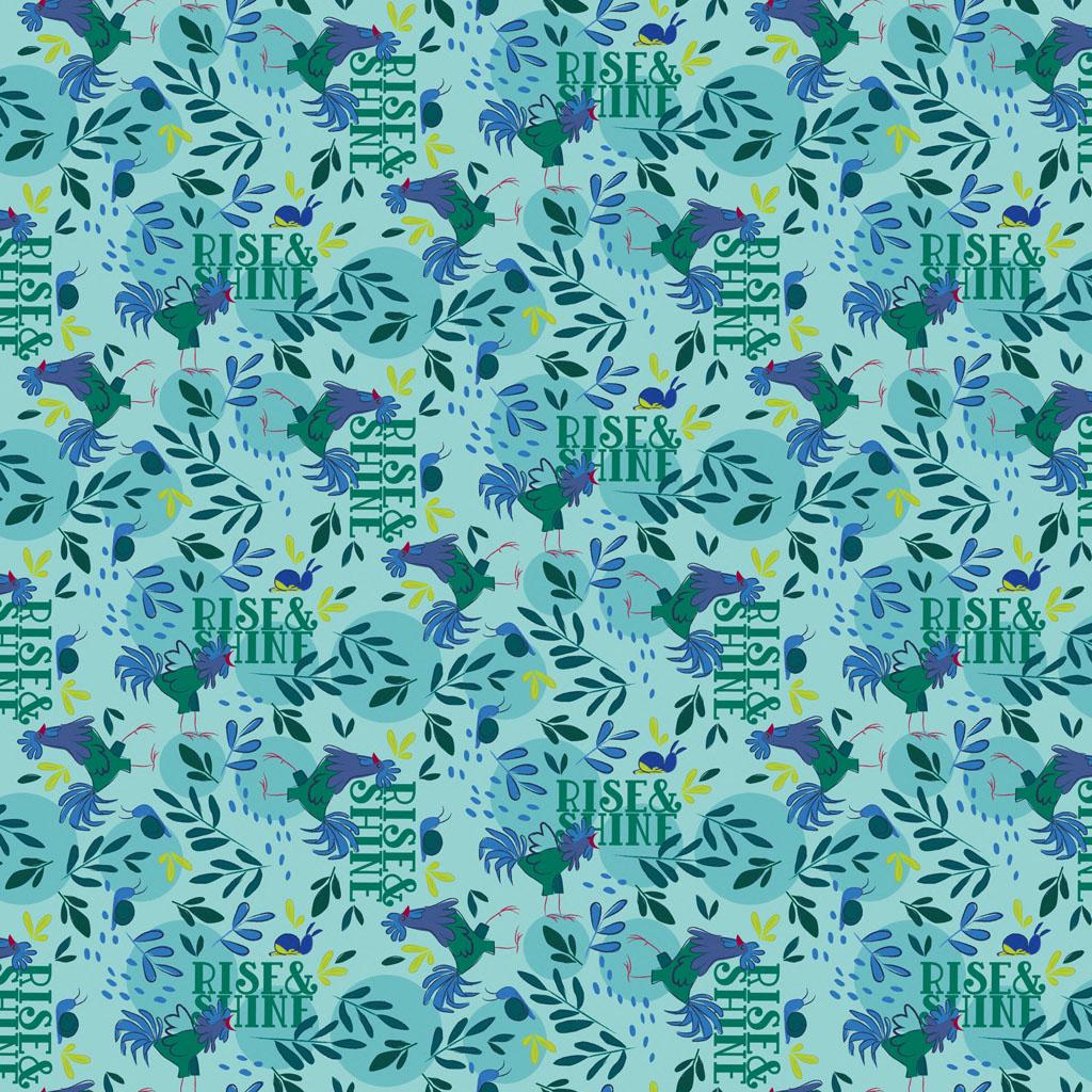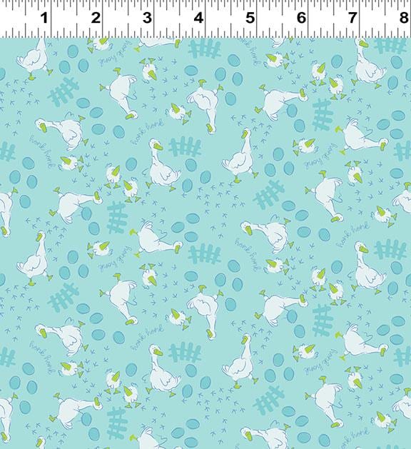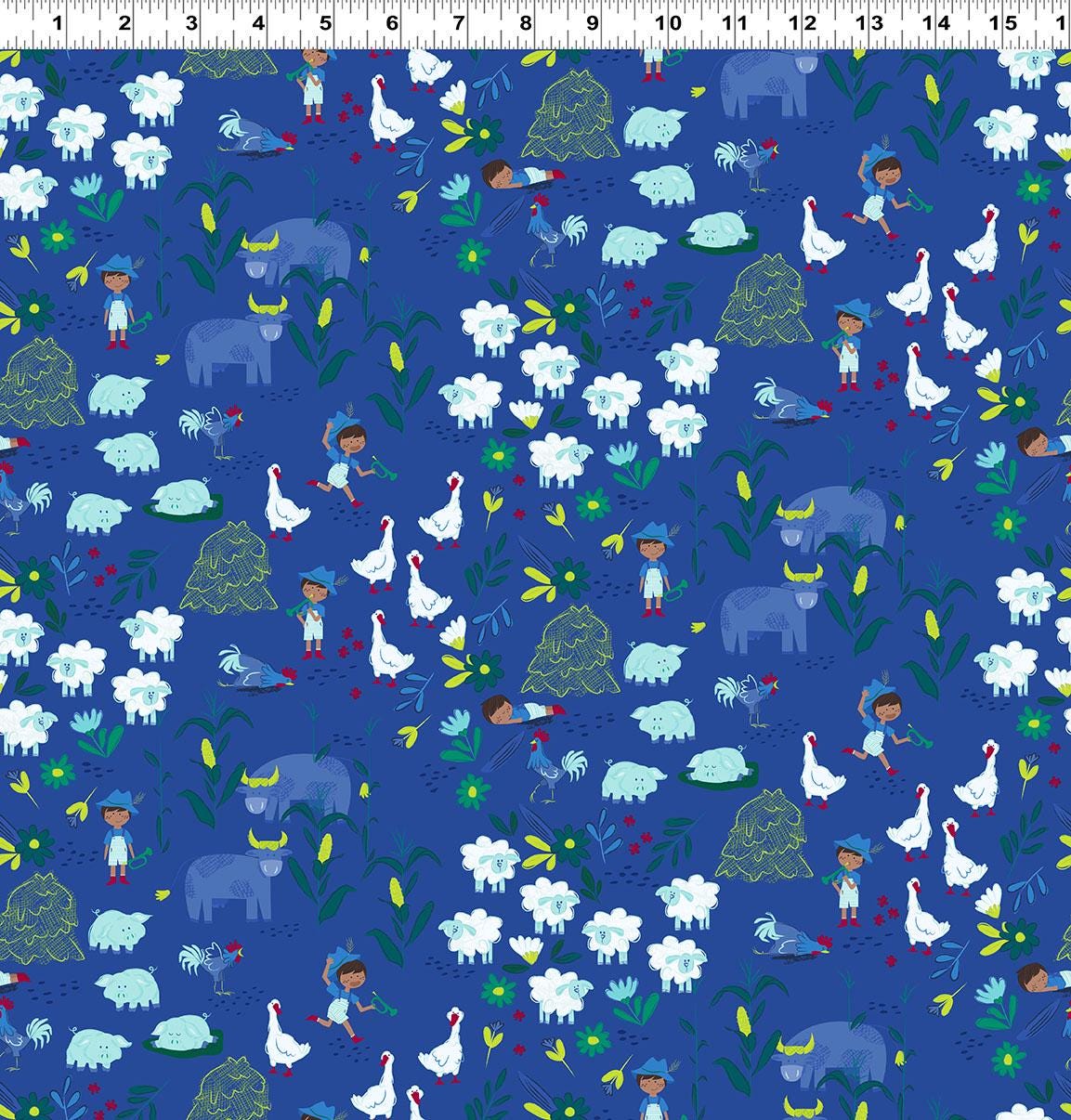 This charming farm-themed design showcases soft blues, aquas, and greens with playful prints including cows, pigs, sheep, geese, florals, haystacks, and classic nursery motifs β perfect for a baby boy or gender-neutral nursery.
