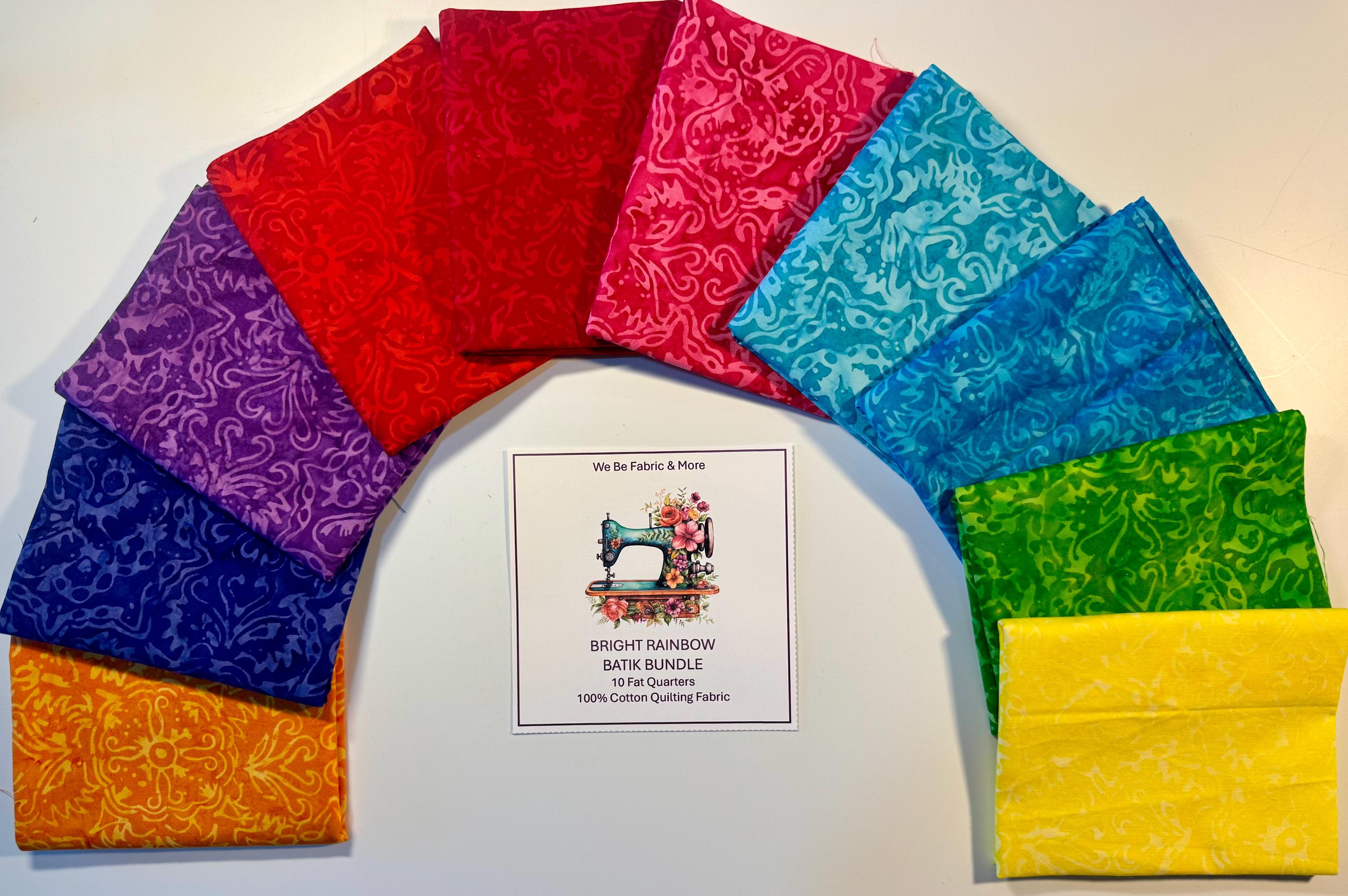 This carefully curated set includes 10 bold and colorful batik fat quarters, spanning the full rainbow from rich reds to deep blues. Perfect for modern quilts, scrap projects, and brightening up any fabric stash.