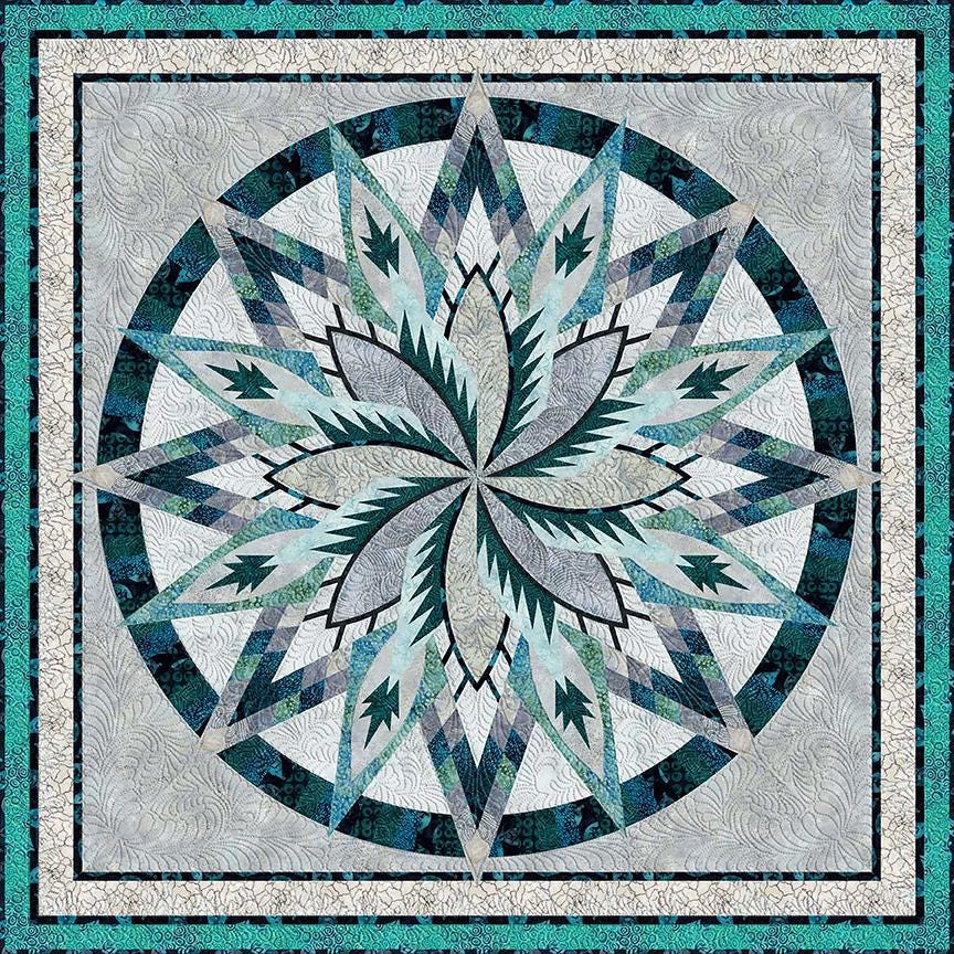 Designed by Quiltworx, this breathtaking quilt features intricate paper piecing and shimmering batik fabrics in cool tones of teal, silver, and blue. The dramatic circular design creates a striking, heirloom-quality piece.