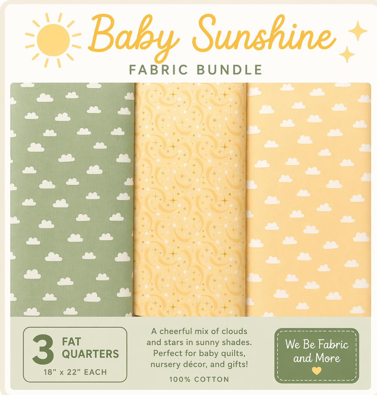 Bright, cheerful, and full of warmth, this Baby Sunshine fabric bundle features soft clouds and playful shooting stars in sunny yellow tones — perfect for baby quilts and nursery projects.