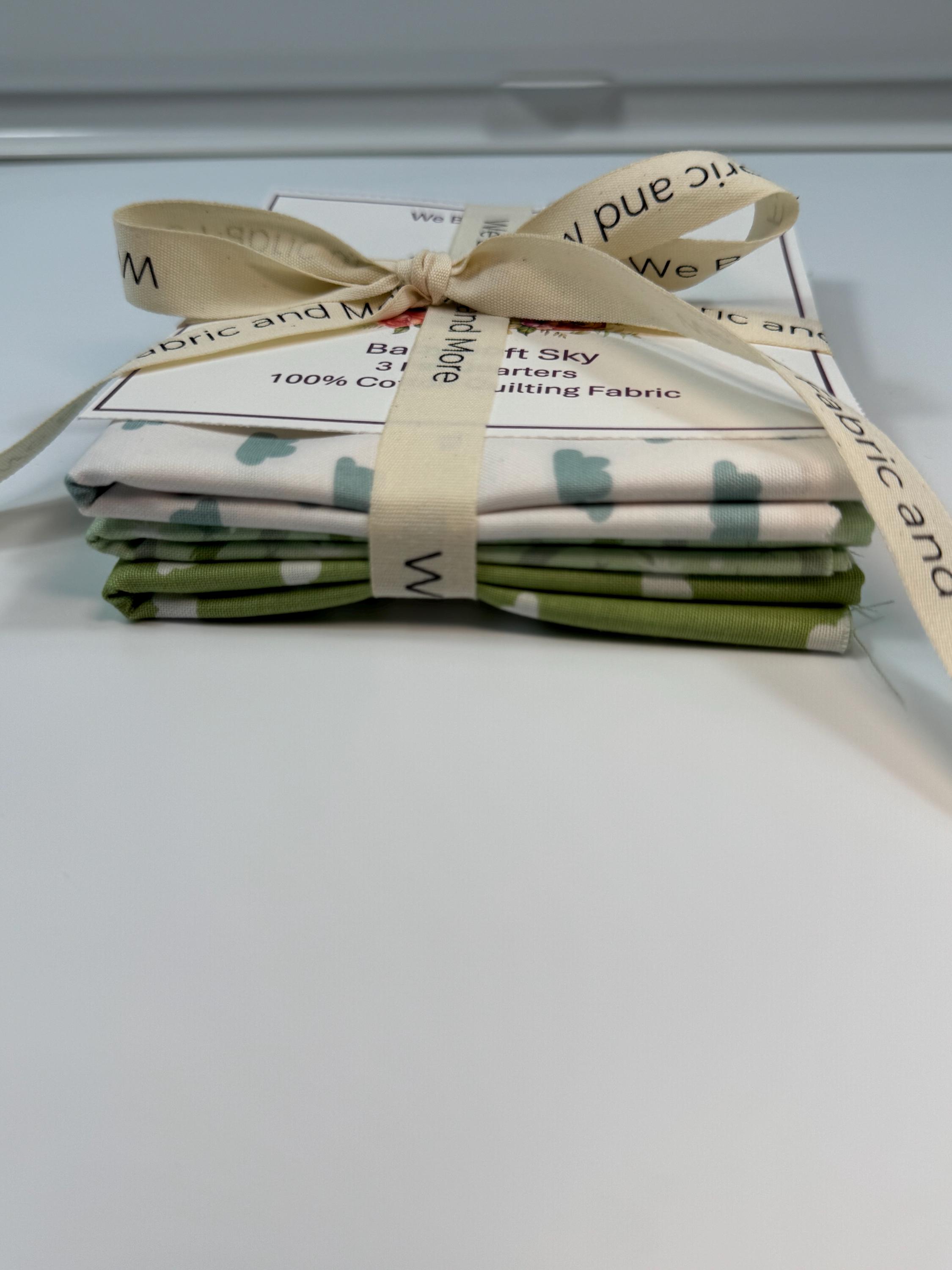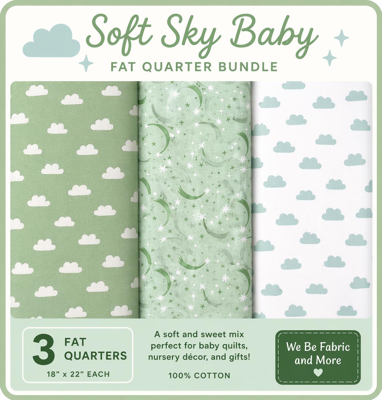 Sweet and soothing, this Soft Sky Baby fabric bundle features soft clouds and gentle shooting stars in calming green and white tones. Perfect for baby quilts, nursery décor, and thoughtful handmade gifts.