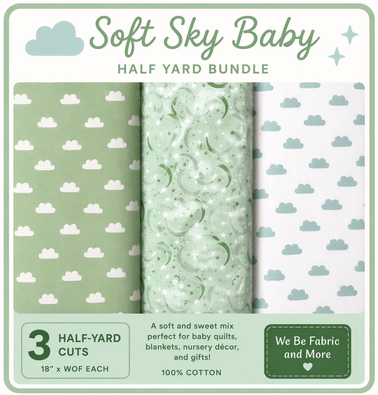 Soft and calming, this Soft Sky Baby fabric bundle features gentle clouds and shooting stars in beautiful green and white tones. Designed for larger projects, these half-yard cuts give you more fabric while keeping everything perfectly coordinated.